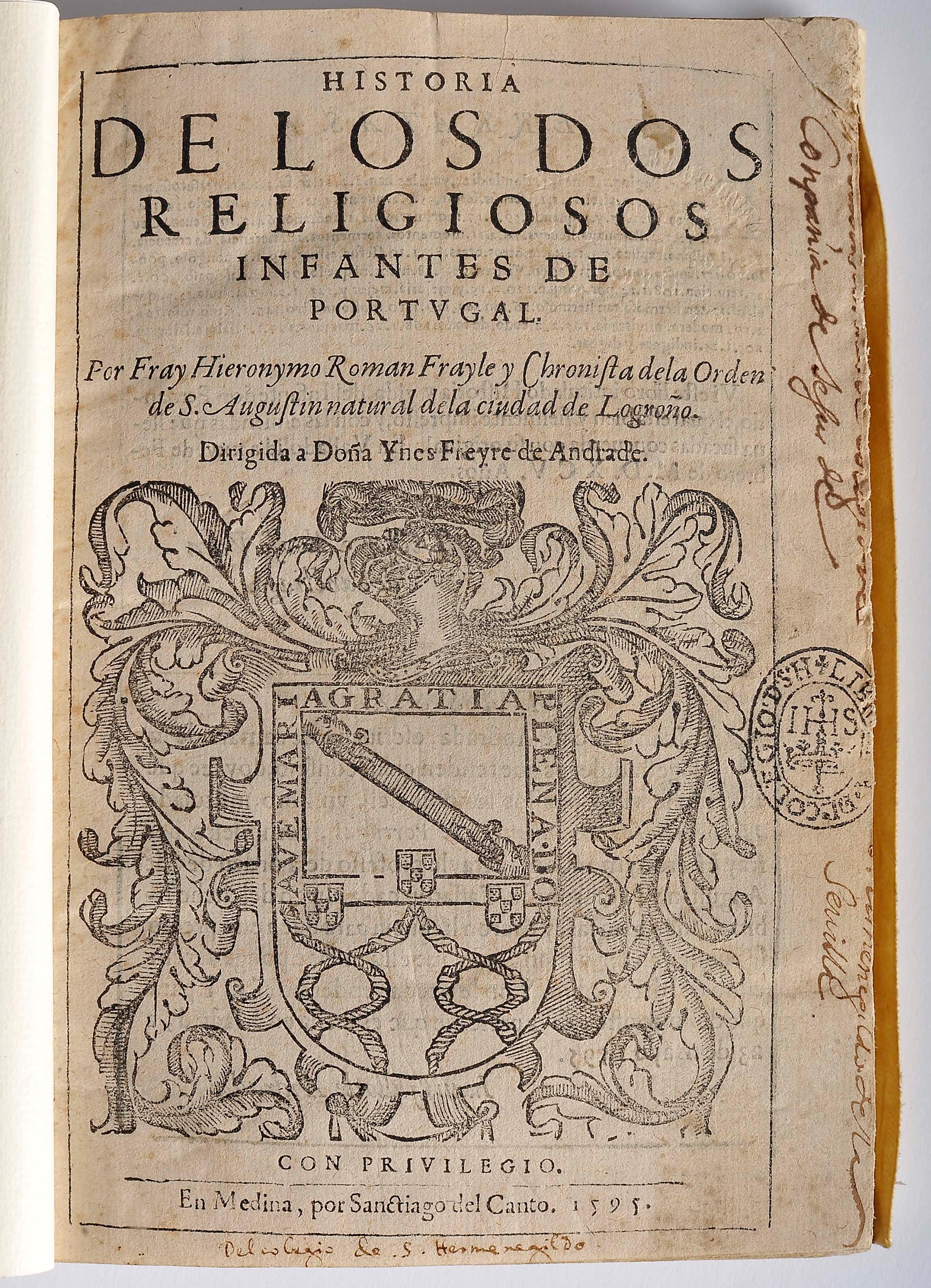 ROMAN Y ZAMORA, Frei Jerónimo, O.S.A.- HISTORIA | DE LOS DOS | RELIGIOSOS | INFANTES DE | PORTVGAL | Por Fray Hieronymo Roman Frayle y Chronista de la Orden | de S. Augustin natural de la ciudad de Logroño. | Dirigida a Doña Ynes Freyre de Andrade.- En Medina: por Santiago del Canto, 1595.- [12], 205, [3] f.; 20 cm.- E. Friar Jerónimo Roman y Zamora (1535-1597), Augustine religious and chronicler of the order, born in Logroño, was in Portugal more than once, the last time in 1586, the year in which he wrote the present work. The copy, a little cropped and with some browning, may have been washed. Title page with several old ownership marks and a stamp of an institution of the Society of Jesus (in the lower margin: Del Colegio de S. Hermenegildo). Fourth preliminary sheet (†4) with minor faults. Other minor imperfections. It is, however, complete and solid. Recent binding, full parchment, with handwritten title on the spine. Palau, 265586-86. Library of King D. Manuel II of portugal, 647.
