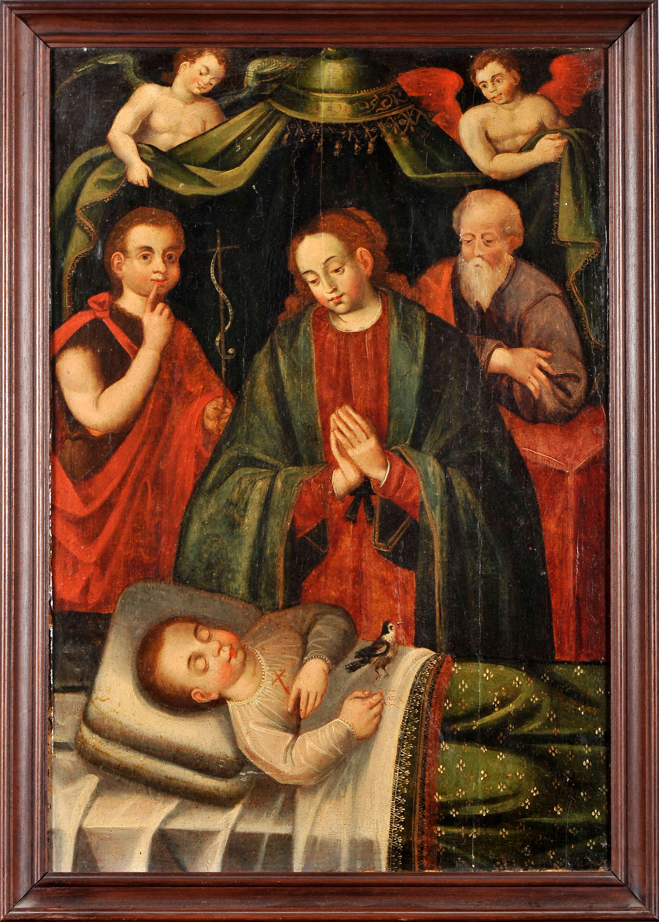 The sleep of the Child Jesus with Our Lady, Saint Joseph, Saint John the Baptist, two angels and bird oil on wood European school 16th/17th C. various restorations Dimensões (altura x comprimento x largura) - 59 x 40 cm