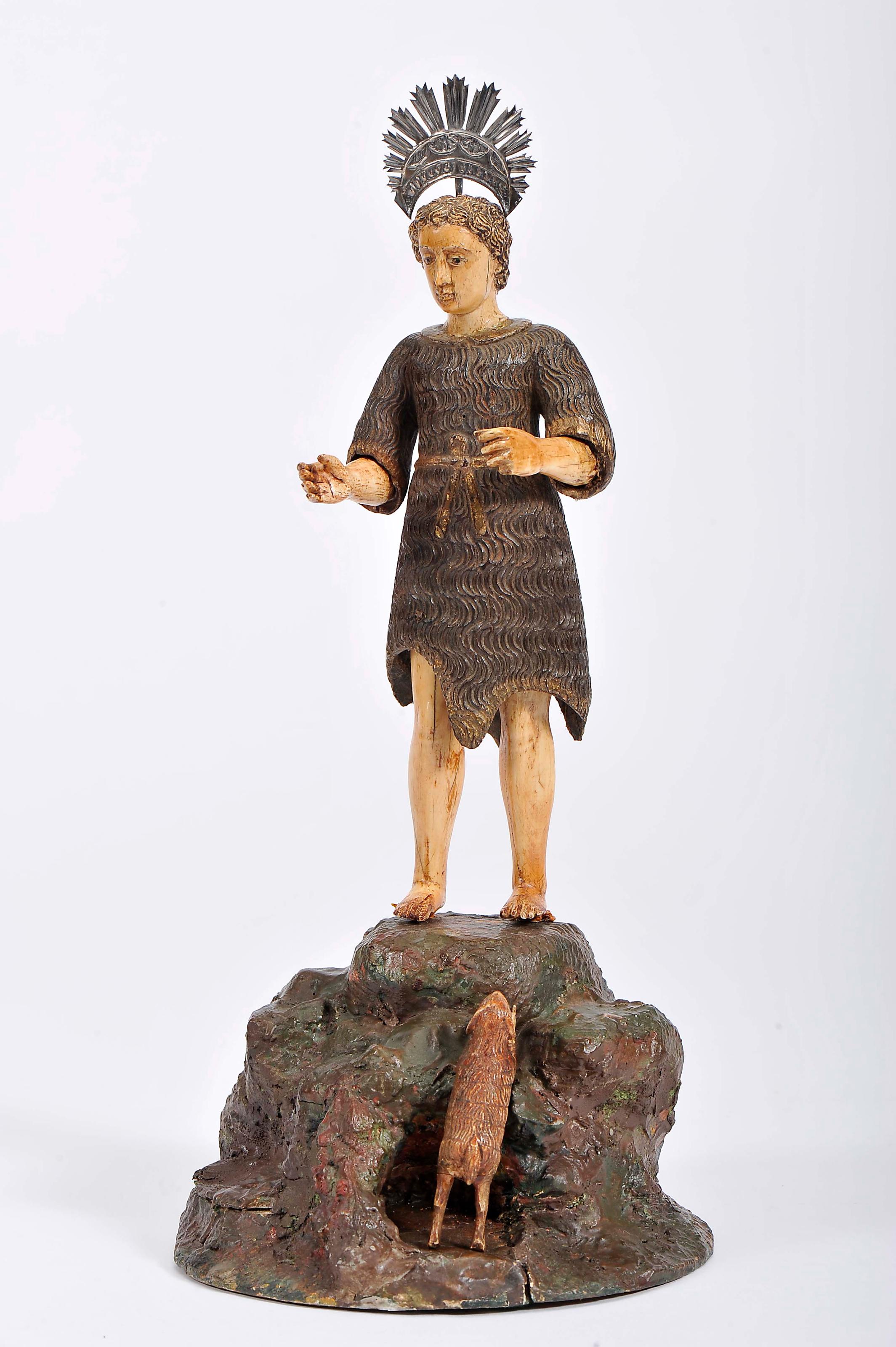 Saint John the Baptist and lamb on a rock ivory and ebony sculptures Indo-Portuguese 17th./18th C. non original St. John's arm and lamb's legs restoration and glueing unmarked silver pursuant to Decreto-Lei nº 120/2017, of 15 September - art. 2, no. 2, subparagraph c) Dimensões (altura x comprimento x largura) - 24 cm Notes: This lot is subject to CITES export/import restrictions and is duly certified: nr 22PTLX09151C.Cabral Moncada Leilões warns that several countries prohibit the importation of goods that incorporate materials from protected wild fauna and flora species, including, among others, ivory, coral and tortoiseshell. Therefore, we advise potential buyers to inform themselves in advance about the applicable legislation, in particular the customs regulations in force in the countries concerned.