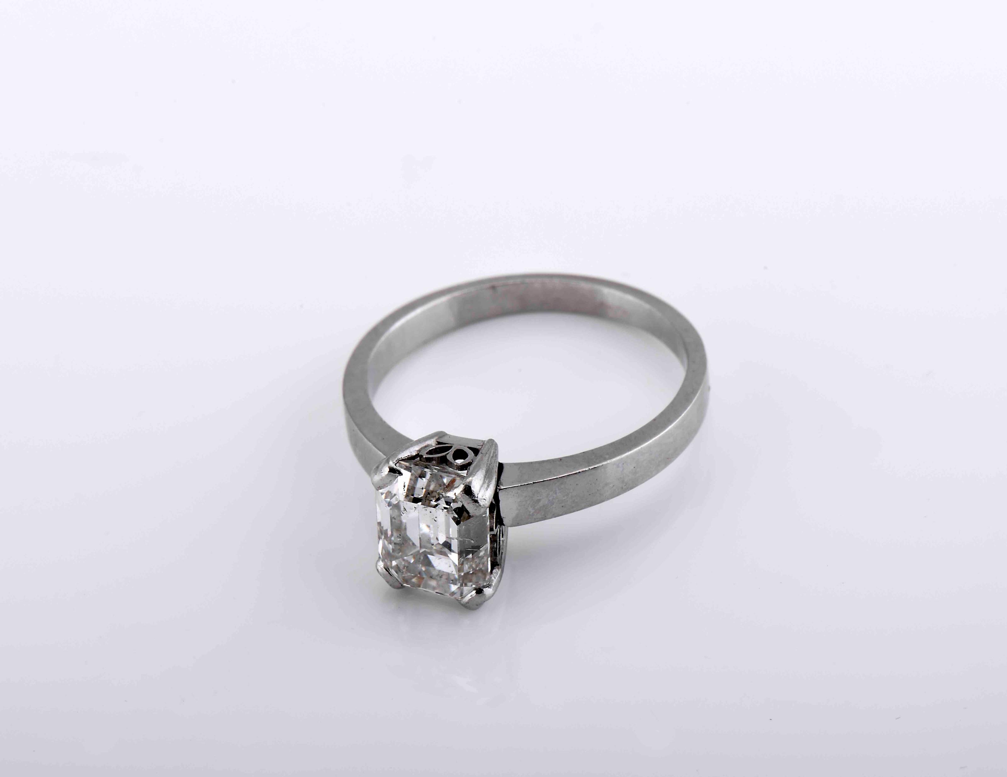A ring platinum set with an emerald cut diamond with the approximate weight of 1.91 ct., colour grade L~M, P1 purity and low fluorescence 20th C. (mid) signs of use without marks, pursuant to Decreto-Lei nº 120/2017, of September 15 - art. 2, paragraph 2, letter c) Dimensões (altura x comprimento x largura) - 11 (16 mm) cm; Peso - 4,24 g.