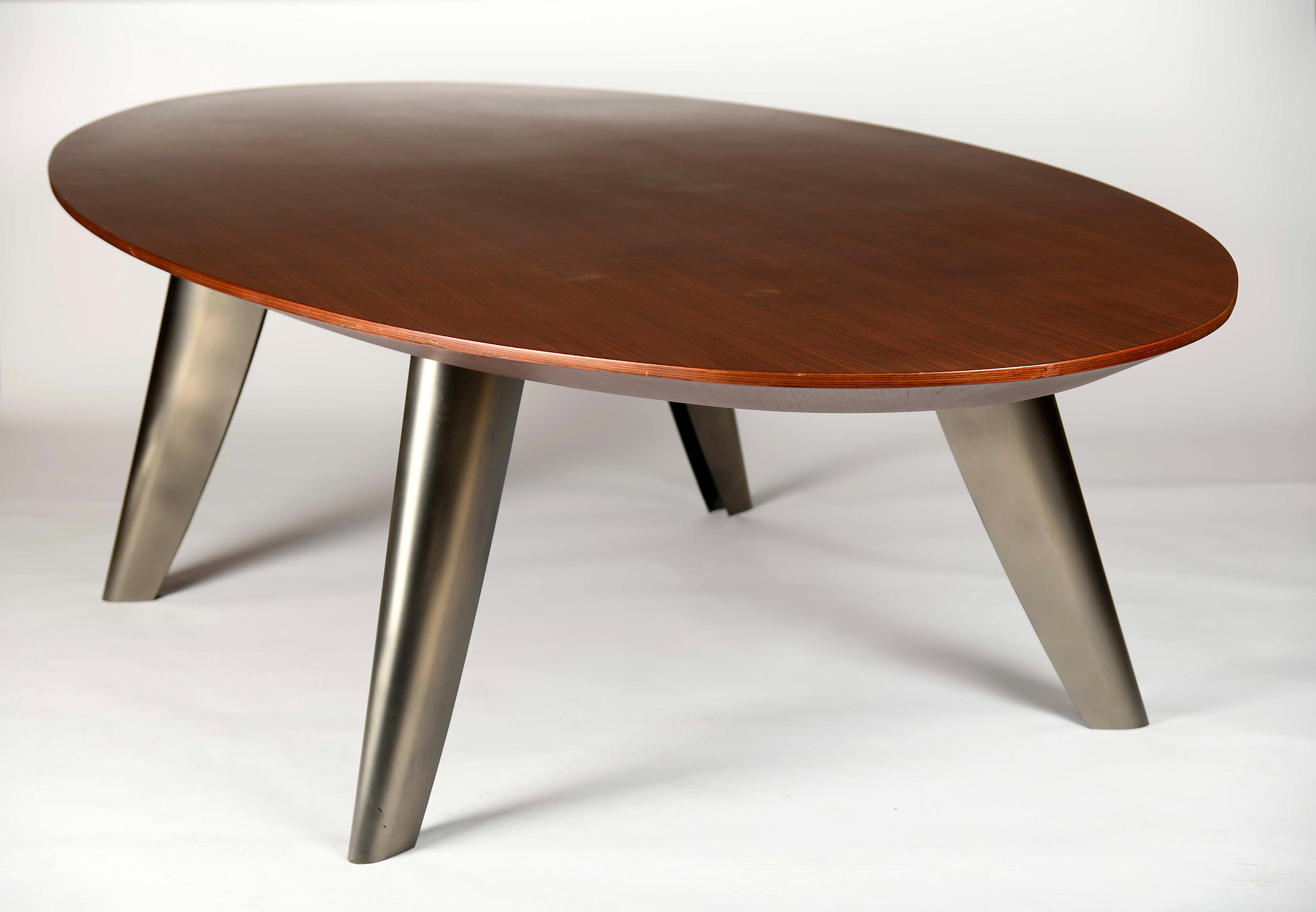 LAURA MERONI A table Brazilian-rosewood veneer top lacquered metal feet signs of use Bartoli design - model BD12 Dimensões (altura x comprimento x largura) - 73 x 280,5 x 140,5 cm Notes: Private collection - Porto. Vd. https://www.laurameroni.com/en/products/furniture-tables-sofas/tables/bd-12 - consulted on October 24, 2024 at 13:13.