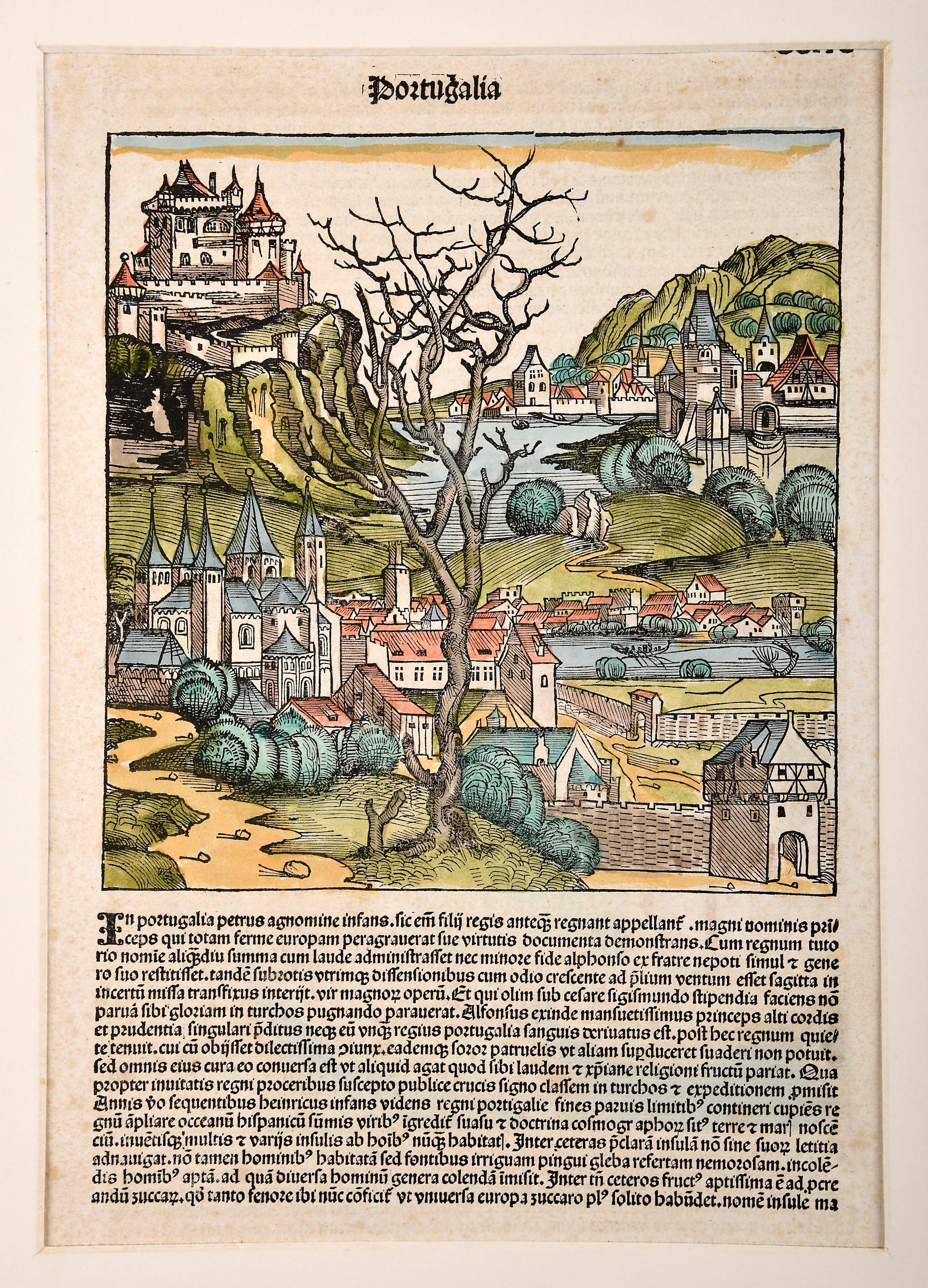 GRAVURA.- PORTVGALIA.- [Vista imaginária da cidade de Lisboa].- Nuremberg: Anton Koberger, for Sebald Schreyer and Sebastian Kammermeister,1493.- gravura xilográfica; 360 mm (folha) Hand-coloured xylographic on paper, probably from the work “Liber chronicarum” by Hartmann Schedel (1440-1514), known as the “Nuremberg Chronicle”, published in that city in 1493. includes descriptive text in Latin with Gothic characters; on the verso, an imaginary view of an Italian city, accompanied by its respective text. German proof slightly trimmed, the colouring is probably not original, paper with slight browning. Dimensões (altura x comprimento x largura) - 36 x 25,5 cm Notes: the work "Liber chronicarum" or "Nuremberg Chronicle" is illustrated with nearly 1800 engravings, some of them repeated, depicting European cities. - vd. https://am.uc.pt/bib-geral/item/44707 - Accessed on October 22, 2025 at 10:22 AM.