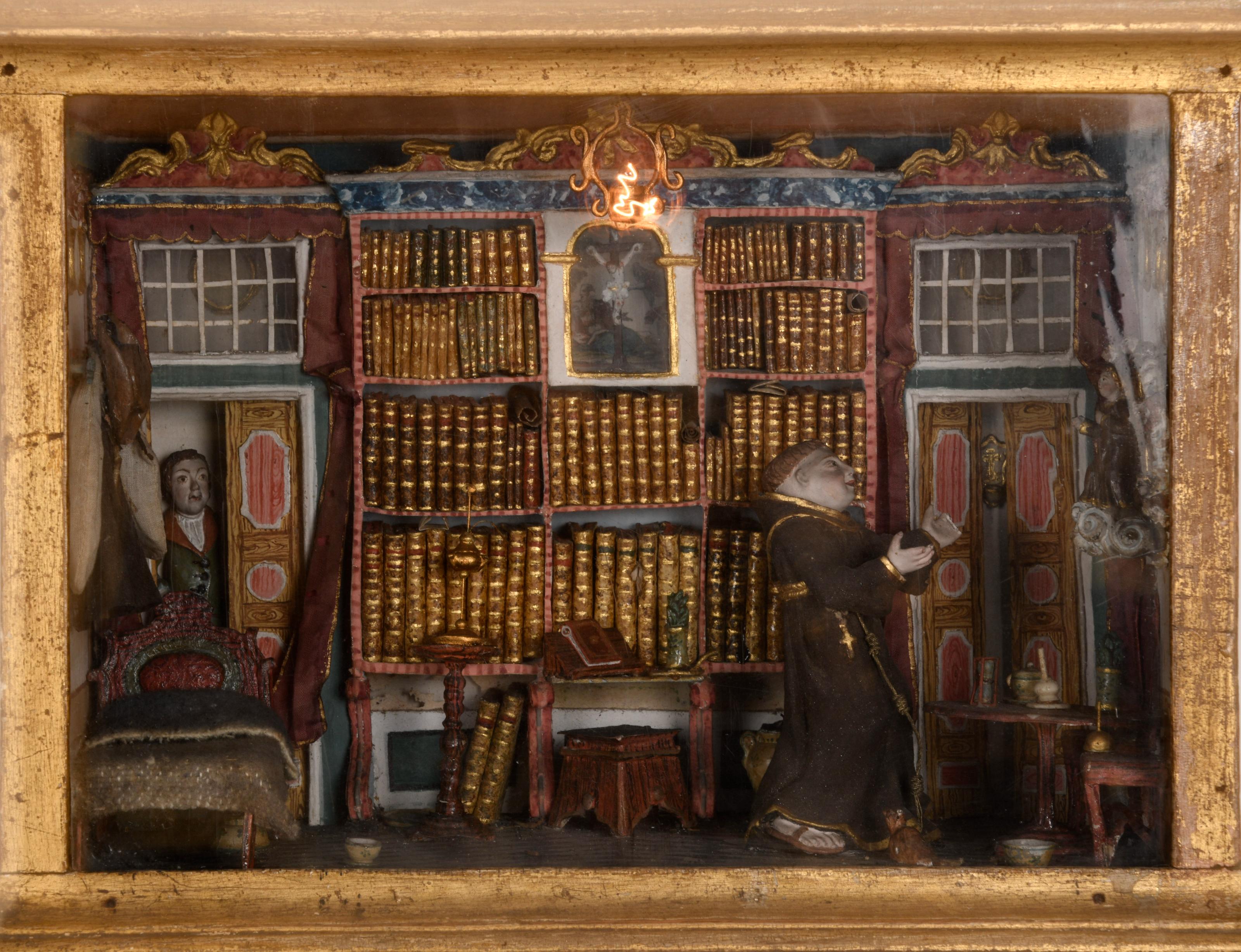 Saint Anthony adoring a sculpture of the infant Jesus in his cell furnished with a library D. Maria I, Queen of Portugal (1777-1816) polychrome and gilded terracotta sculptures, interior in wood, fabric and other materials small painted, marbled and gilded wooden machine Portuguese missing hand of Saint Anthony, other minor faults and defects, electrified interior Dimensões (altura x comprimento x largura) - (maquineta) 28,5 x 36,5 x 20 cm