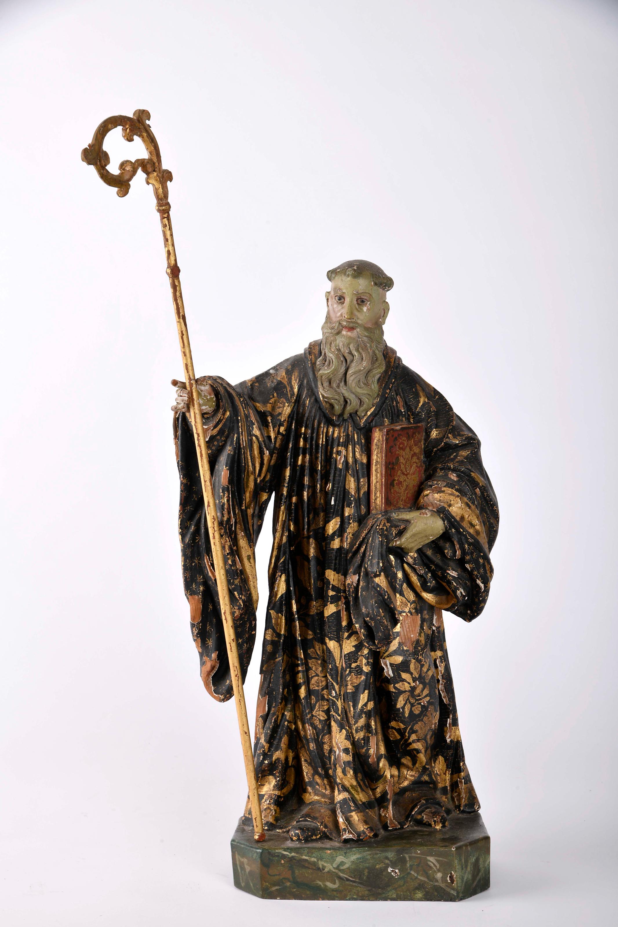 Saint Benedict gilt and polychrome wooden sculpture carved and gilt wooden staff Portuguese 18th C. (1st half) missing fingers on the right hand, faults and defects to the gilt and polychrome. Dimensões (altura x comprimento x largura) - (esculturas) 52 cm