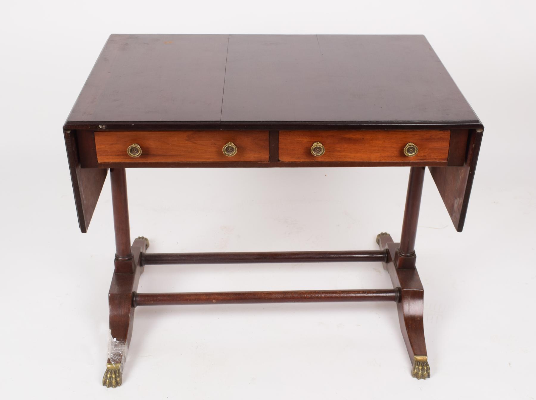 Sofa table mogno pernas e travejamento torneados, ponteiras zoomórficas em metal amarelo portuguesa séc. XX (1ª metade) Dimensões (altura x comprimento x largura) - (fechada) 67 x 85 x 60 cm