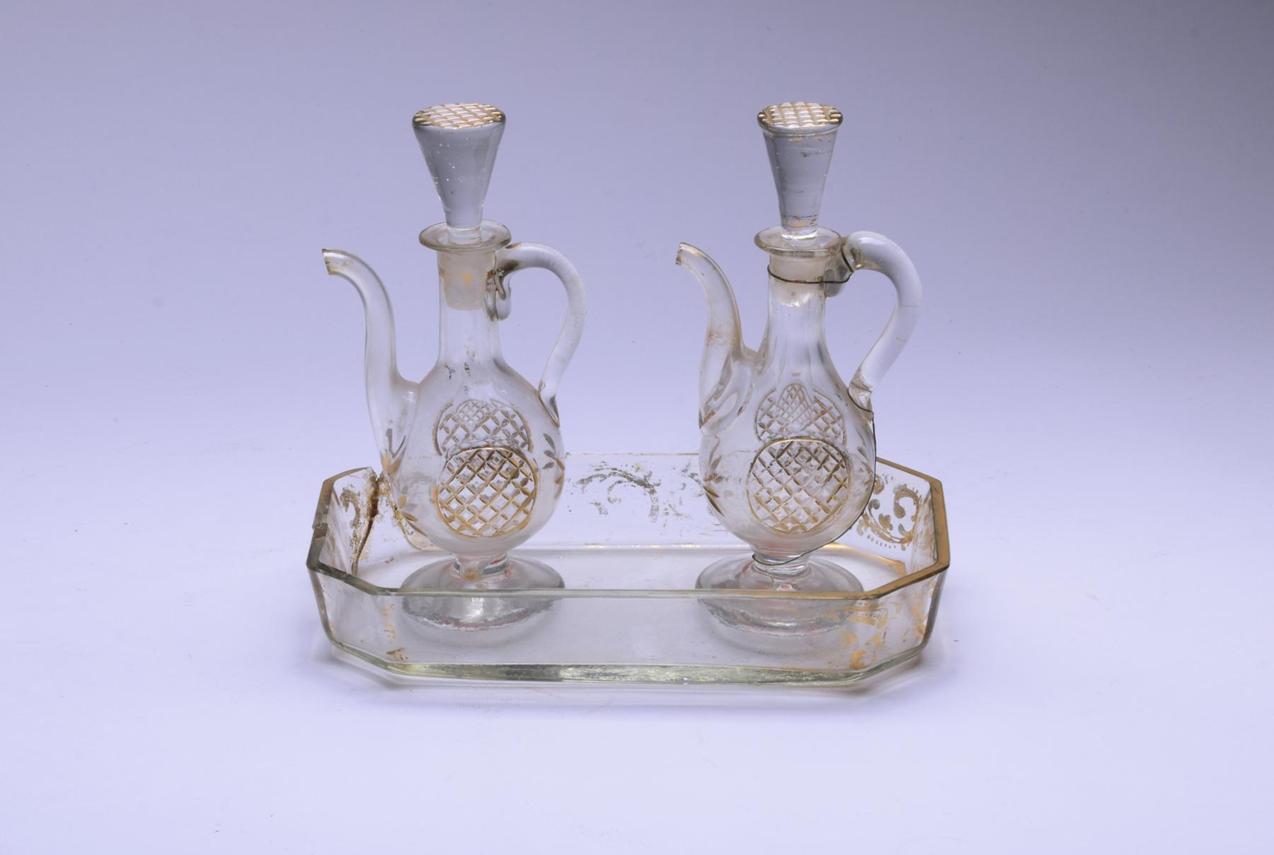 Par de galhetas com bandeja vidro soprado decoração a dourado portuguesas séc. XIX bandeja partida e colada, falta no interior de uma tampa, desgaste na decoração Dimensões (altura x comprimento x largura) - (galheta) 15,5 cm