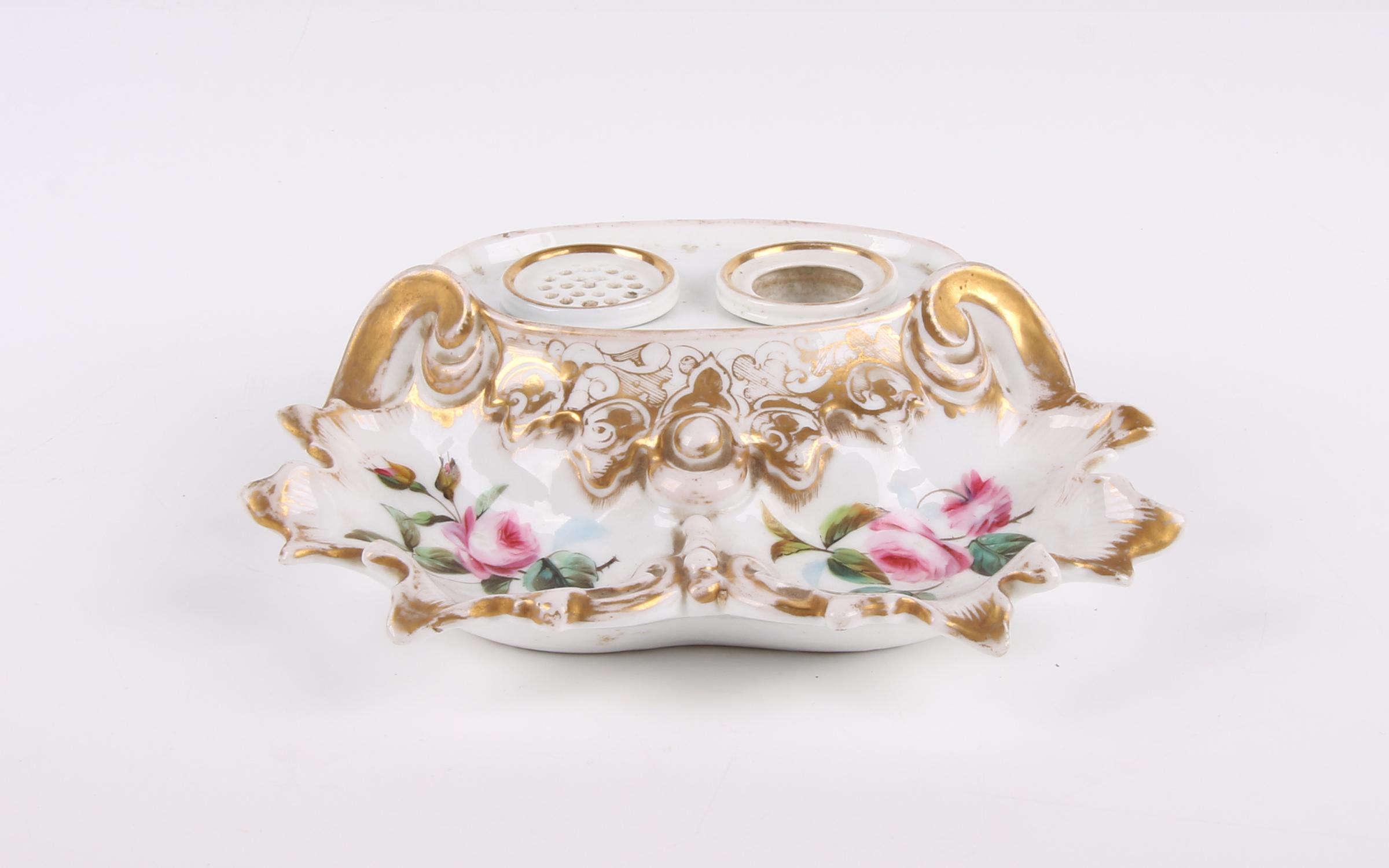 Escrivaninha porcelana decoração relevado, policromada e dourada "Flores" francesa séc. XIX (meados) desgastes no dourado Dimensões (altura x comprimento x largura) - 5,5 x 21 x 17 cm