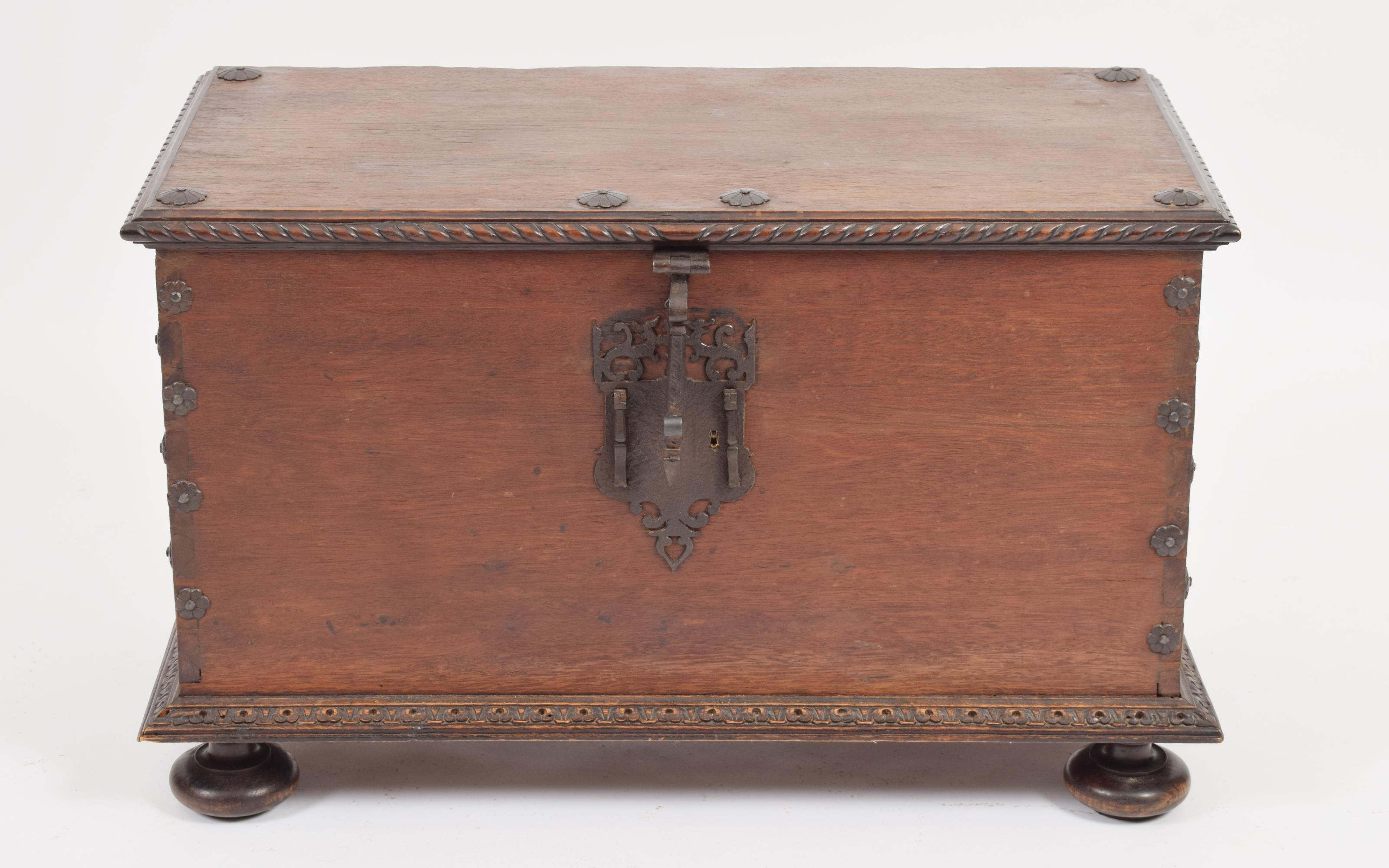 Arca pequena sicupira vermelha tampo e base moldurados por friso entalhado, ferragens e aplicações em ferro, pés torneados Portuguesa séc. XVII sem chave, trancada, ferragens e aplicações posteriores, falta de escaninho no interior Dimensões (altura x comprimento x largura) - 49 x 80 x 41 cm