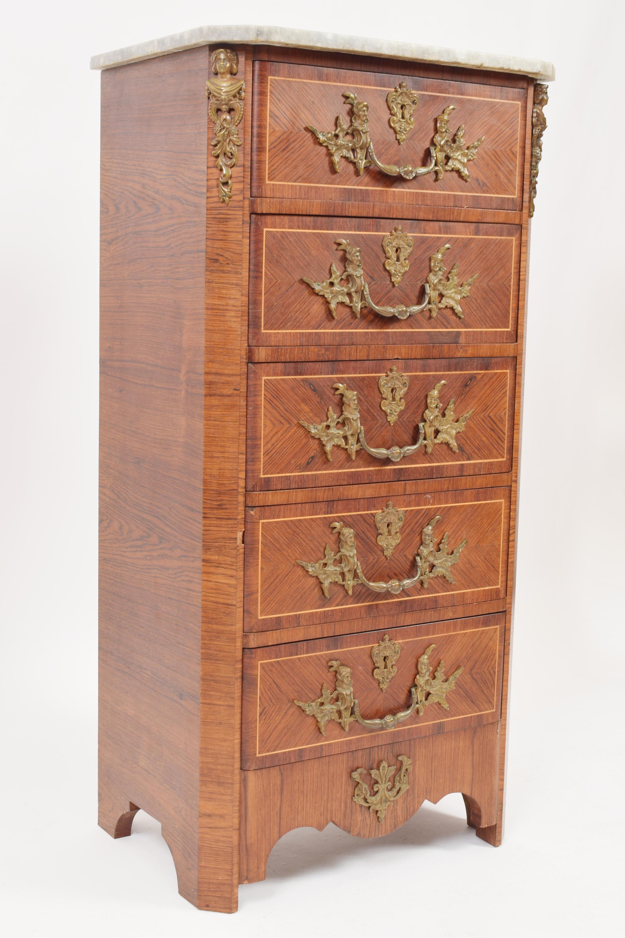 Camiseiro estilo Napoleão III pau-santo folheado, mogno, espinheiro e outras madeiras tampo de formato rectangular em pedra mármore, caixa de linhas direitas com cinco gavetas, decoração de friso embutido, aplicações e ferragens em bronze, pés recortados Portuguesa séc. XX com chave, falhas, manchas e defeitos Dimensões (altura x comprimento x largura) - 114 x 56 x 38,5 cm