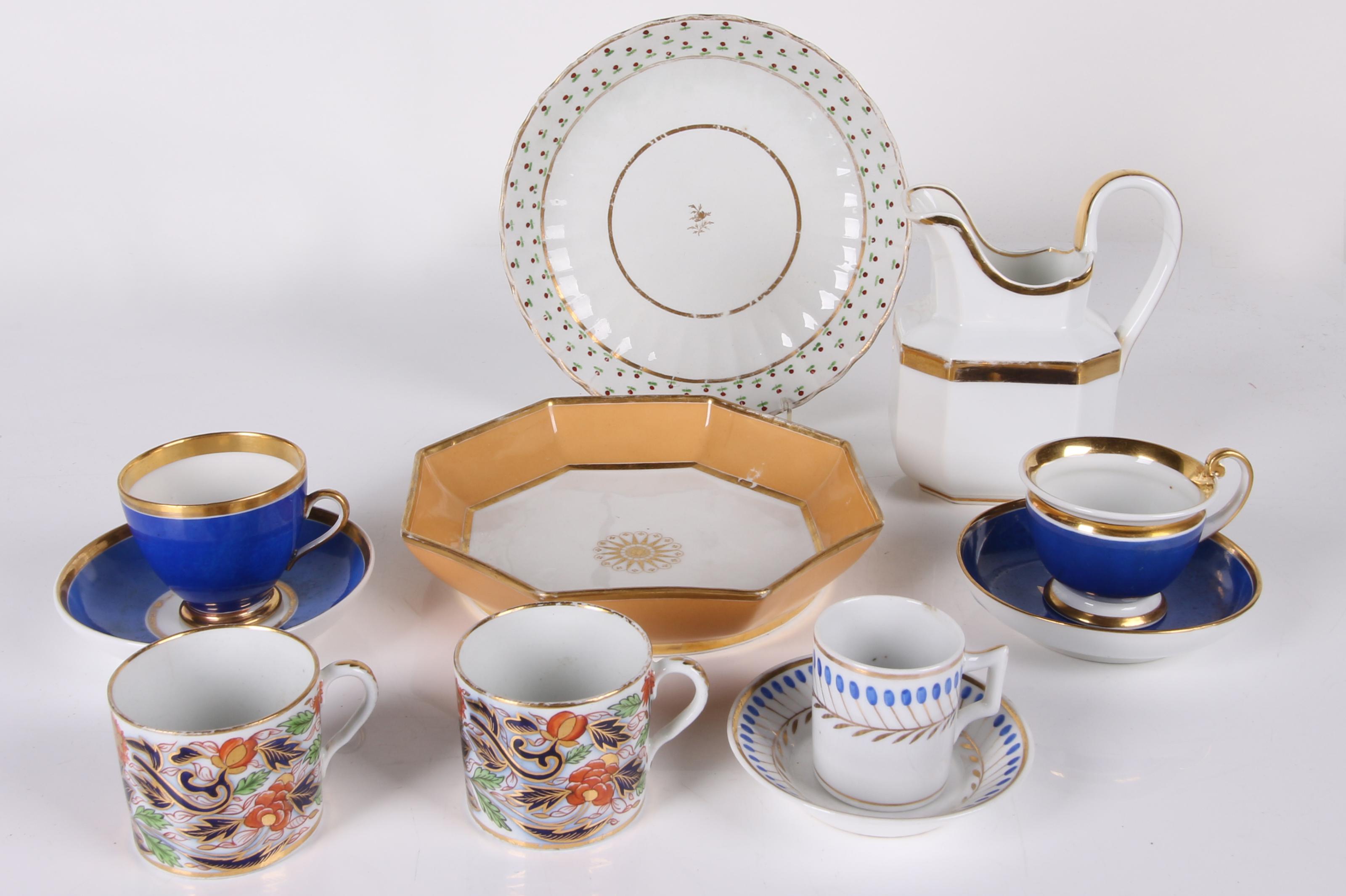 Lote de peças porcelana decorações diversas, composto por leiteira, 2 covilhetes, três chávenas de café com pires e 2 chávenas Europeias séc. XIX e XX pequenos defeitos, cabelos, colagens Dimensões (altura x comprimento x largura) - (covilhete maior) 4 x 20,5 x 21 cm