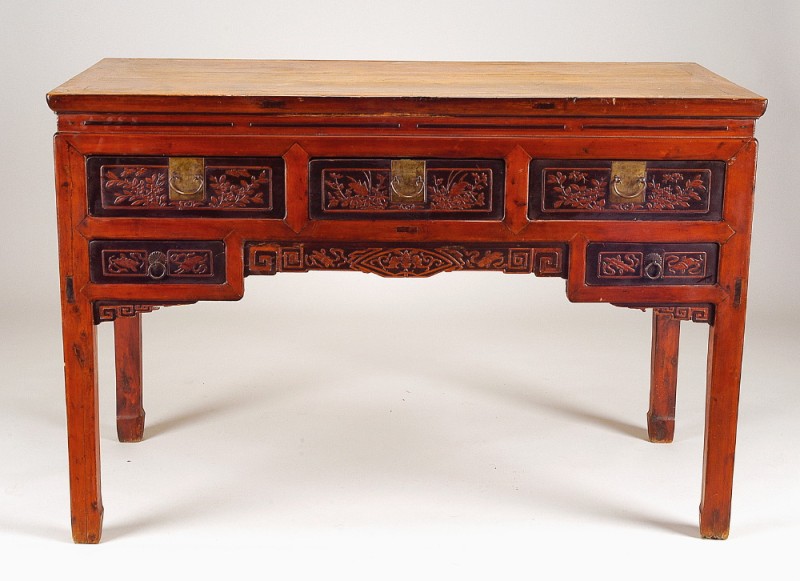 Mesa madeira exótica relevada e pintada China séc. XIX pequenas faltas e defeitos Dimensões (altura x comprimento x largura) - 89 x 131 x 59,5 cm