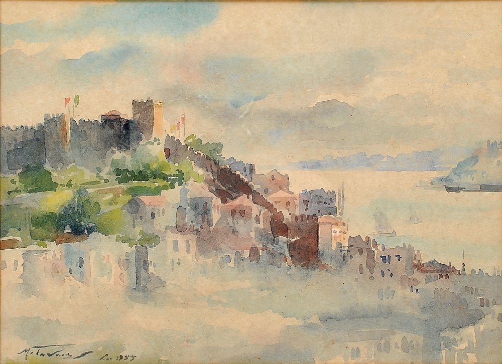 MANUEL TAVARES - 1911-1974 "Encosta do Castelo - Lisboa" aguarela sobe papel assinada e datada de Lisboa - 1955 Dimensões (altura x comprimento x largura) - 20 x 28 cm