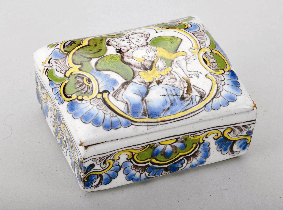 Caixa faiança de Delft decoração policromada em todas as faces incluindo a do fundo e o interior da tampa "Cena galante" e "Paisagens" holandesa séc. XVIII assinada PIER Dimensões (altura x comprimento x largura) - 4,5 x 8,5 x 7 cm