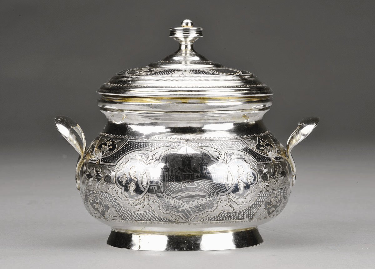 Açucareiro prata decoração gravada e a niello "Vistas de cidade", marca de teor de 84 zlotnick, marca de ensaiador de Moscovo (1877), marca de ourives IF Rússia logeiras amolgadelas remarcado com marca de importação austríaca (1921-1922) Dimensões (altura x comprimento x largura) - 14 cm; Peso - 423 grs.
