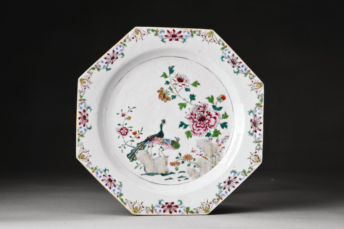 Prato oitavado grandes dimensões porcelana da China, Companhia das Índias decoração policromada "Pavões" reinado Qianlong (1736-1795) Dimensões (altura x comprimento x largura) - 28,5 x 28,5 cm Notas: decoração idêntica às peças do serviço de mesa que pertenceu ao Rei D. José e que o Rei D. João VI levou para o Brasil. Vd. CASTRO, Nuno de - "A Porcelana Chinesa ao Tempo do Império - Portugal/Brasil", ACD Editores, Lisboa, 2007, p. 274.