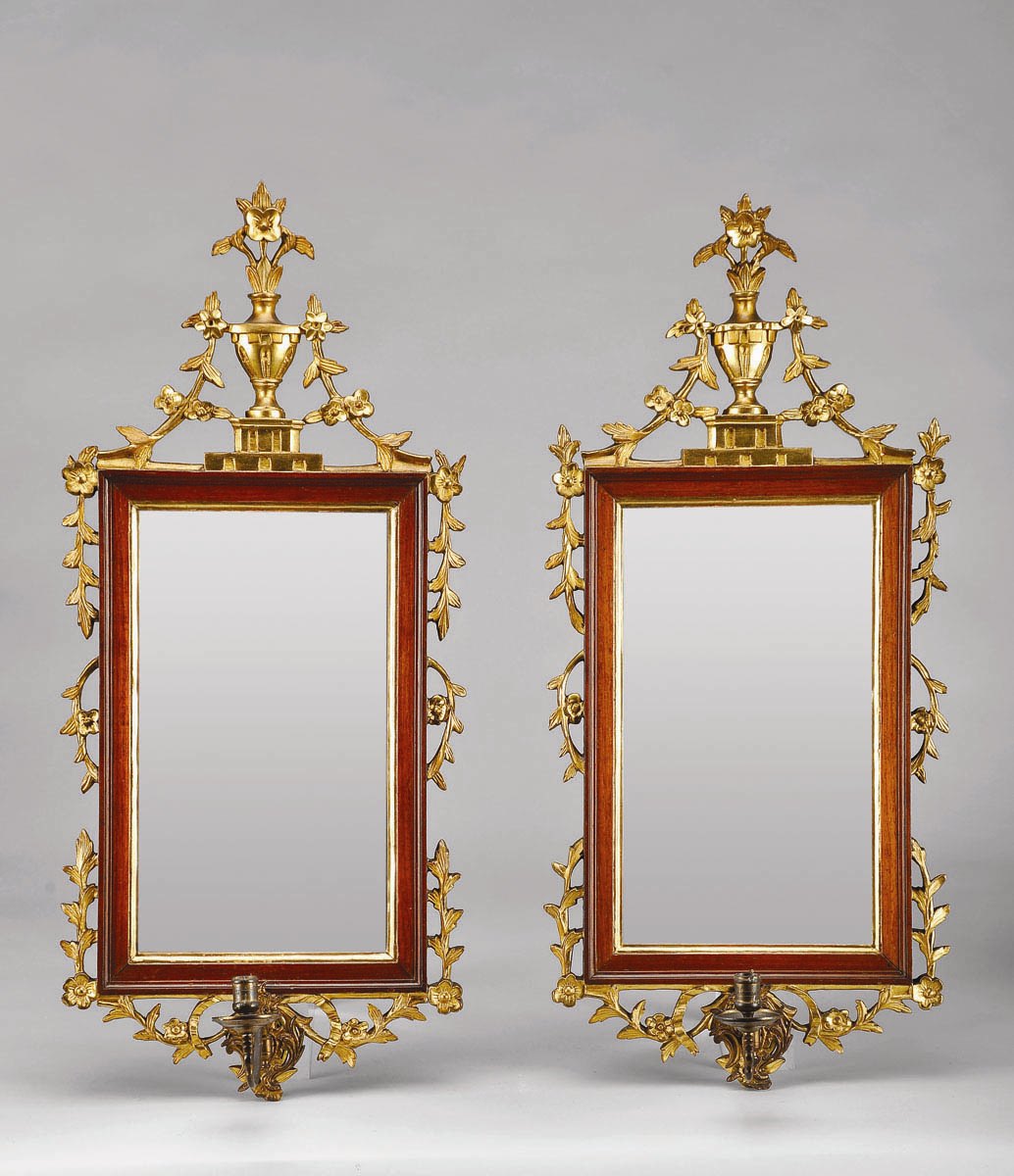 Par de espelhos de parede D. José (1750-1777)/D. Maria (1777-1816) molduras em vinhático com entalhamentos dourados portugueses séc. XVIII pequenas faltas e defeitos Dimensões (altura x comprimento x largura) - 80 x 35 cm