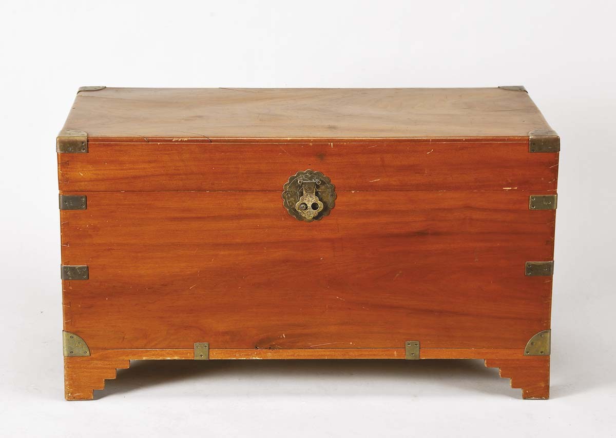 Arca cânfora aplicações em metal amarelo, pegas em ferro Índia séc. XIX faltas e defeitos Dimensões (altura x comprimento x largura) - 59 x 105 x 53 cm