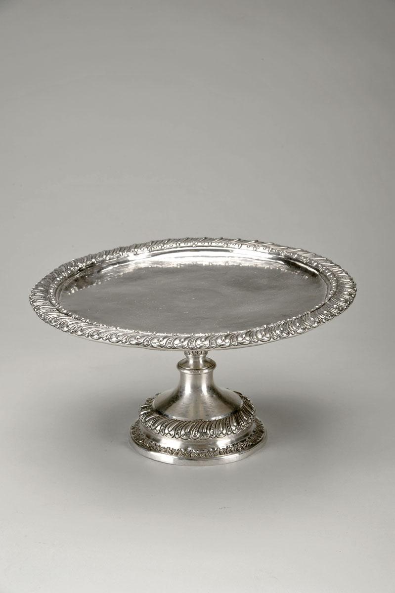 Salva de pé alto D. João V (1707-1750) prata frisos relevados com gomos espiralados, marca de ensaiador de Lisboa (1720-1750), marca de ourives de O/MN (1720-1750) portuguesa pequenas amolgadelas Dimensões (altura x comprimento x largura) - 14 x 26 cm; Peso - 557 grs. Notas: vd. ALMEIDA, Fernando Moitinho de - "Marcas de Pratas Portuguesas e Brasileiras (Século XV a 1887)", IN-CM, 1995, L24 e L457.◙Exemplar idêntico encontra-se representado em SANTOS, Reinaldo dos; QUILHÓ, Irene - "Ourivesaria Portuguesa nas Colecções Particu