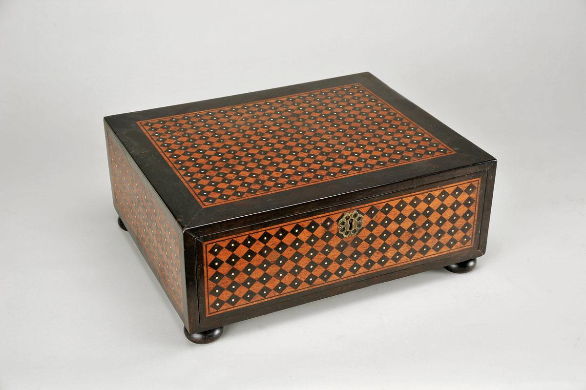 Gaveta Lusíada teca revestimento parcial em ébano, embutidos em ébano e marfim "Losangos" vertente indo-portuguesa séc. XVII interior da gaveta com sinais de ter possuido gavetas e divisórias Dimensões (altura x comprimento x largura) - 16,5 x 41 x 33 cm Notas: exemplar semelhante encontra-se representado em CASTILHO, Manuel - "Imitando o Divino Mestre por terras do Industão", exposição organizada por ocasião do ciclo de conferências «Índia - Terra de Impérios», promovido pela Associação Amigos do Oriente, Novem