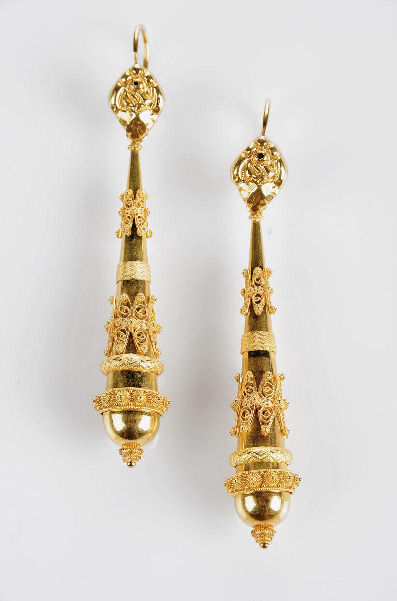 Par de brincos «de fuso» ouro repuxado, cinzelado e filigranado marca de ensaiador do Porto (1881-1886), marca de ourives P pequenos defeitos Notas: exemplares semelhantes encontram-se representados em D?OREY, Leonor - "Esplendor e Fantasia - Cinco Séculos de Joalharia", Museu Nacional de Arte Antiga, Lisboa, 1995, p. 112, fig. 152.◙Vd. VIDAL, Manuel Gonçalves; ALMEIDA, Fernando Moitinho de - "Marcas