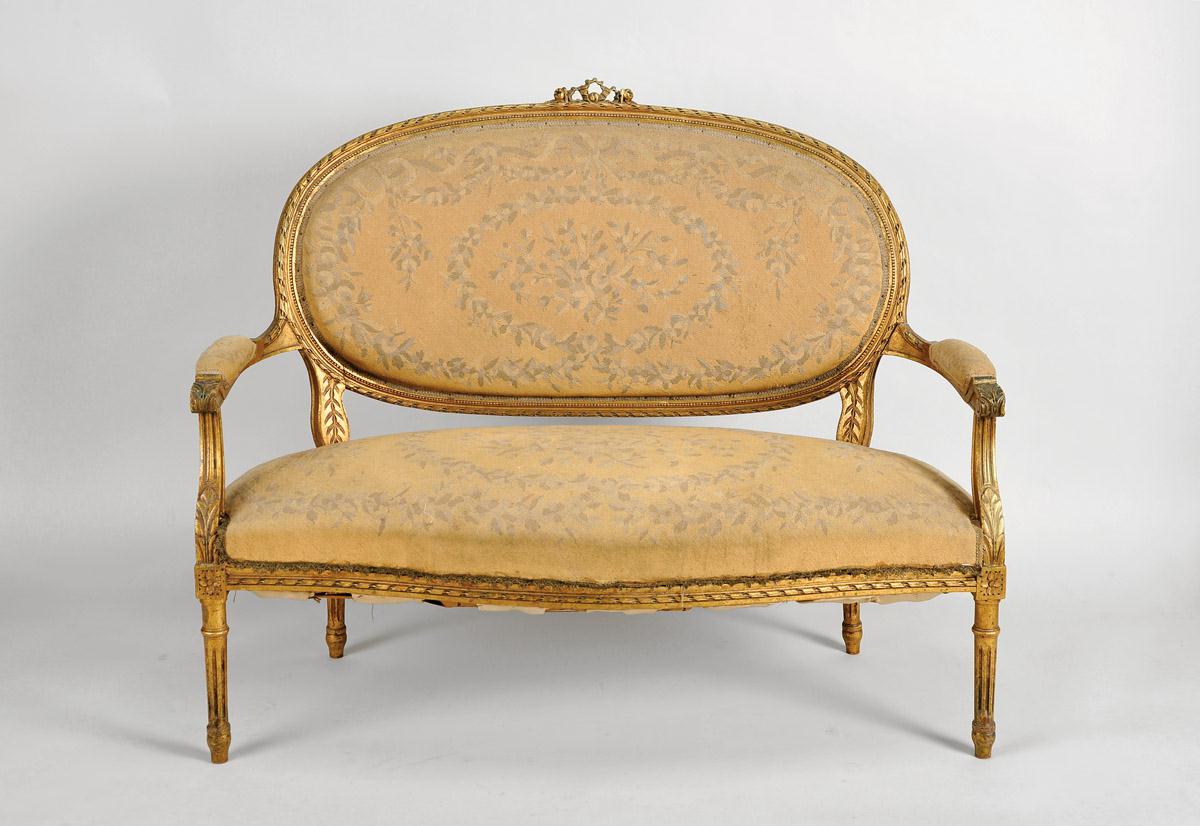 Conjunto de canapé e 4 fauteuils estilo Luís XVI madeira entalhada e dourada com medalhão assento e costas estofados a petit point "Flores" francês séc. XIX pequenas faltas e defeitos, vestígios de insectos xilófagos Dimensões (altura x comprimento x largura) - 106 x 131 x 70 (canapé) cm Notas: fauteuil semelhante encontra-se representado em JANNEAU, Guillaume - "Les Sièges", France, 1967, p. 218, nº 421.