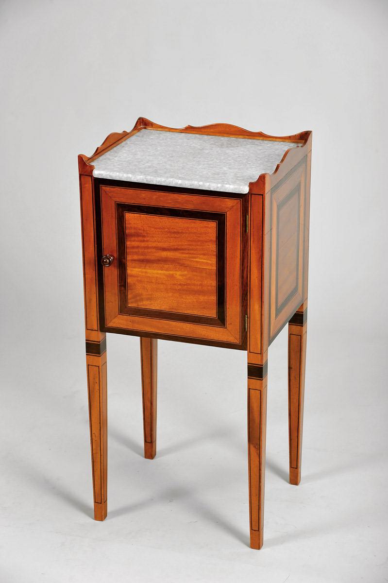 Mesa de cabeceira D. Maria (1777-1816) pau-cetim com marchetaria de pau-santo tampo de pedra mármore portuguesa pequenas faltas e defeitos Dimensões (altura x comprimento x largura) - 76 x 36 x 31 cm