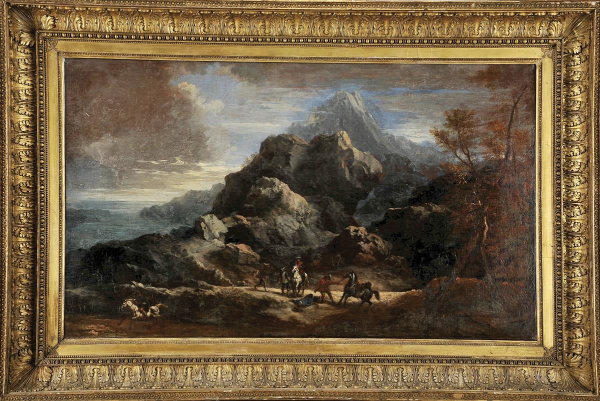 "Paisagem com figuras" óleo sobre tela escola espanhola séc. XVIII reentelado, restauros Dimensões (altura x comprimento x largura) - 80 x 136 cm