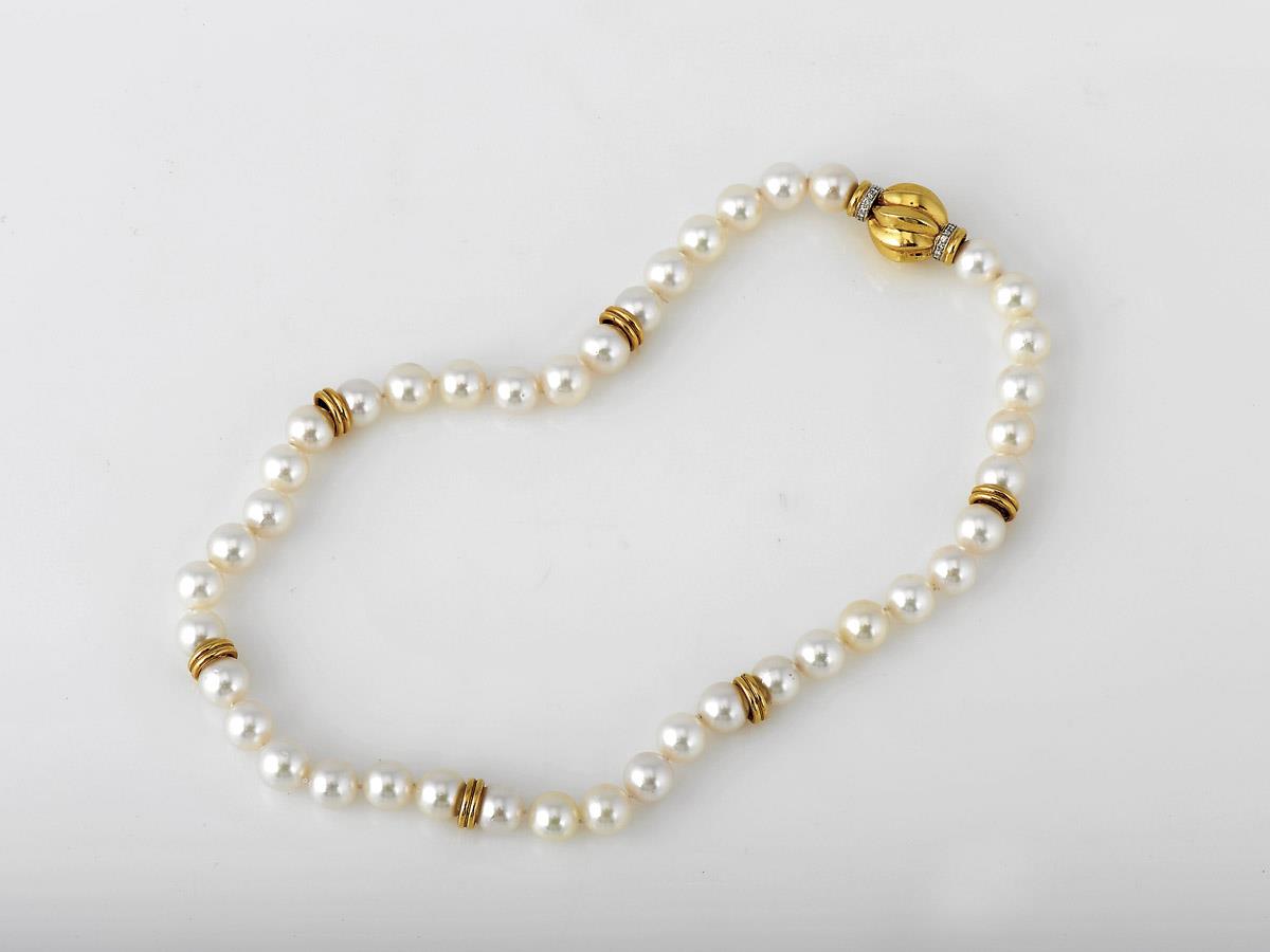 Colar fiada de pérolas Akoya (9~9,5 mm) intercaladas por separadores e fecho em ouro espiralado, cravejado com 26 diamantes em talhe de brilhante com o peso aproximado de 0,19 ct., contraste de Lisboa (pós-1985), marca de ourives não identificado português Dimensões (altura x comprimento x largura) - 43,5 cm Notas: vd. VIDAL, Manuel Gonçalves; ALMEIDA, Fernando Moitinho de - "Marcas de Contrastes e Ourives Portugueses (1887 a 1993)", vol. II. Lisboa: IN-CM, nº 4128.