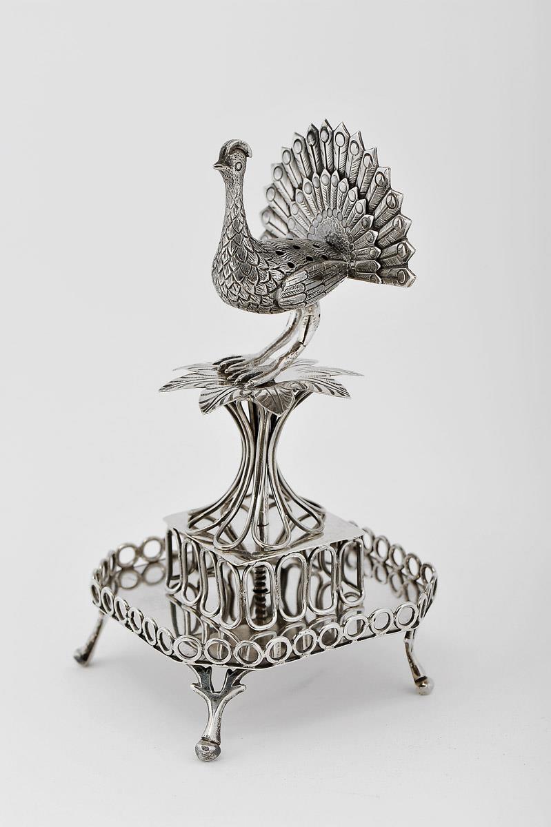 Paliteiro "Pavão" prata base de gradinha com quatro pés, marca de ensaiador de Lisboa (1822-1843) português Dimensões (altura x comprimento x largura) - 13,5 cm; Peso - 130 grs. Notas: vd. ALMEIDA, Fernando Moitinho de - "Marcas de Pratas Portuguesas e Brasileiras (Século XV a 1887)". Lisboa: IN-CM, 1995, L40.