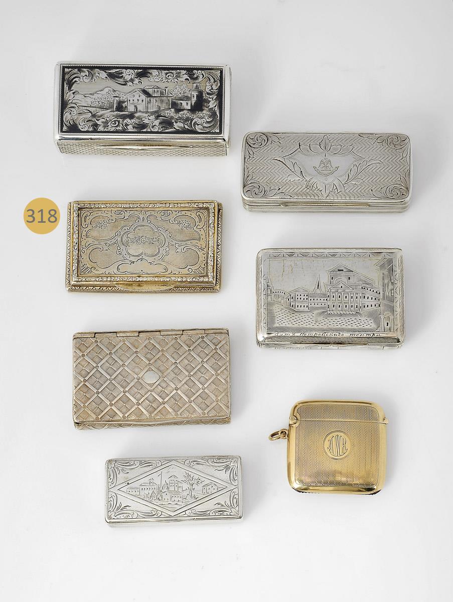 Caixa de rapé prata dourada decoração gravada "Flores", marca da cidade de Praga (1854), marca de ourives AD austro-húngara Dimensões (altura x comprimento x largura) - 5 x 8 cm; Peso - 72 grs.