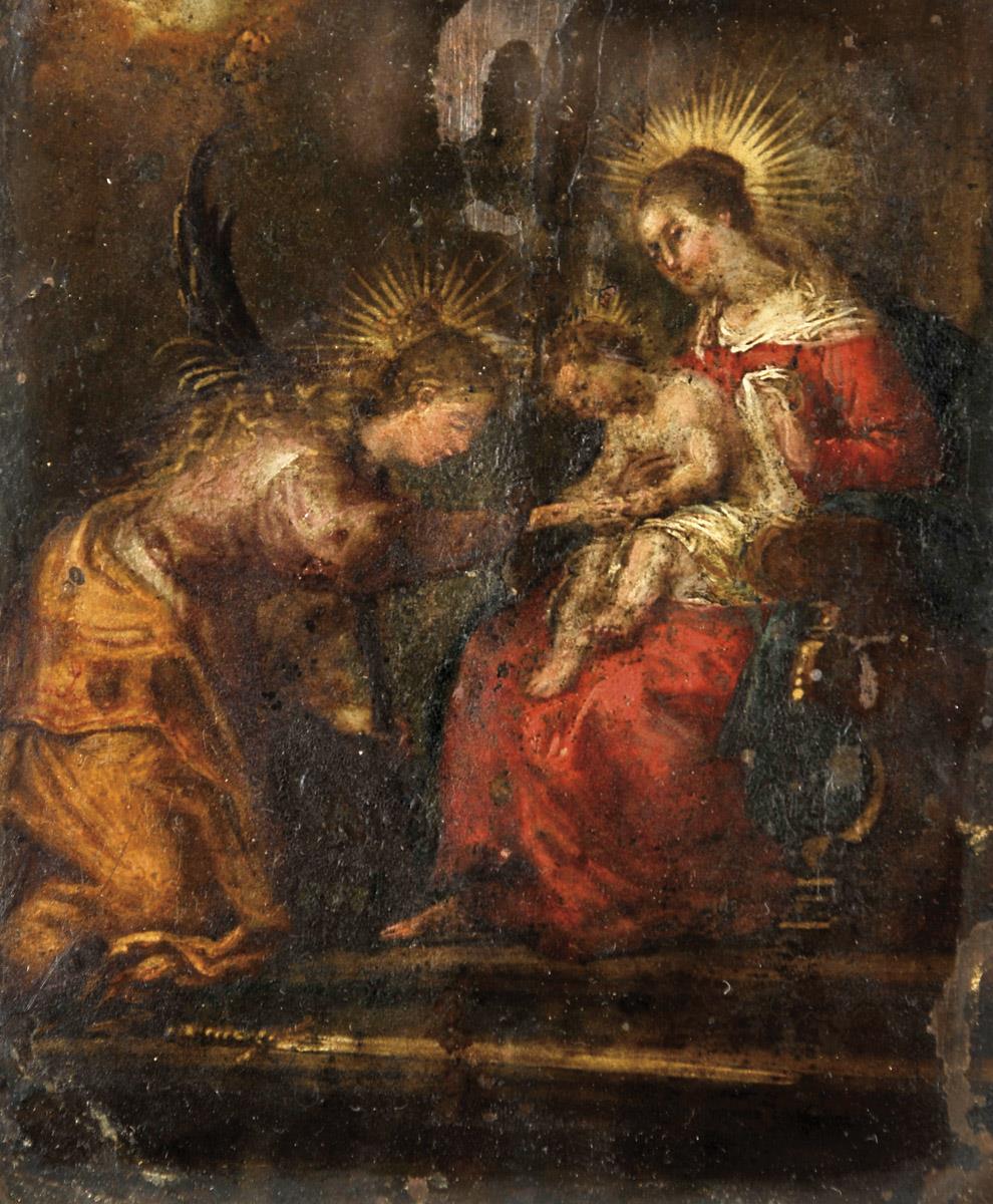 "Nossa Senhora com o Menino Jesus" óleo sobre cobre escola portuguesa séc. XVIII pequenos defeitos Dimensões (altura x comprimento x largura) - 32 x 25 cm