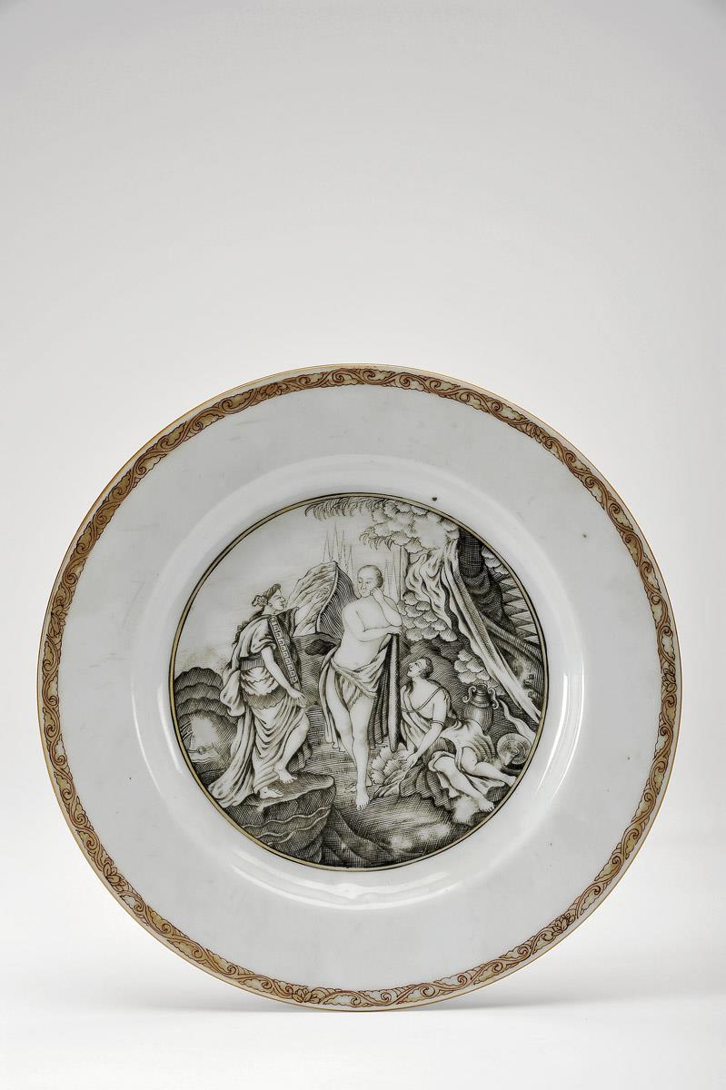 Prato porcelana chinesa de exportação decoração a grisaille e dourado "A escolha de Hércules" reinado Qianlong (1736-1795) ligeira esbeiçadela Dimensões (altura x comprimento x largura) - 23 cm Notas: exemplar semelhante, com decoração da aba diversa, encontra-se representado em HERVOUET, François et Nicole; BRUNEAU, Yves - "La Porcelaine des Compagnies des Indes a Décor Occidental". Paris: Flammarion, 1986, p. 313, nº 13.81, onde é referido que se tra