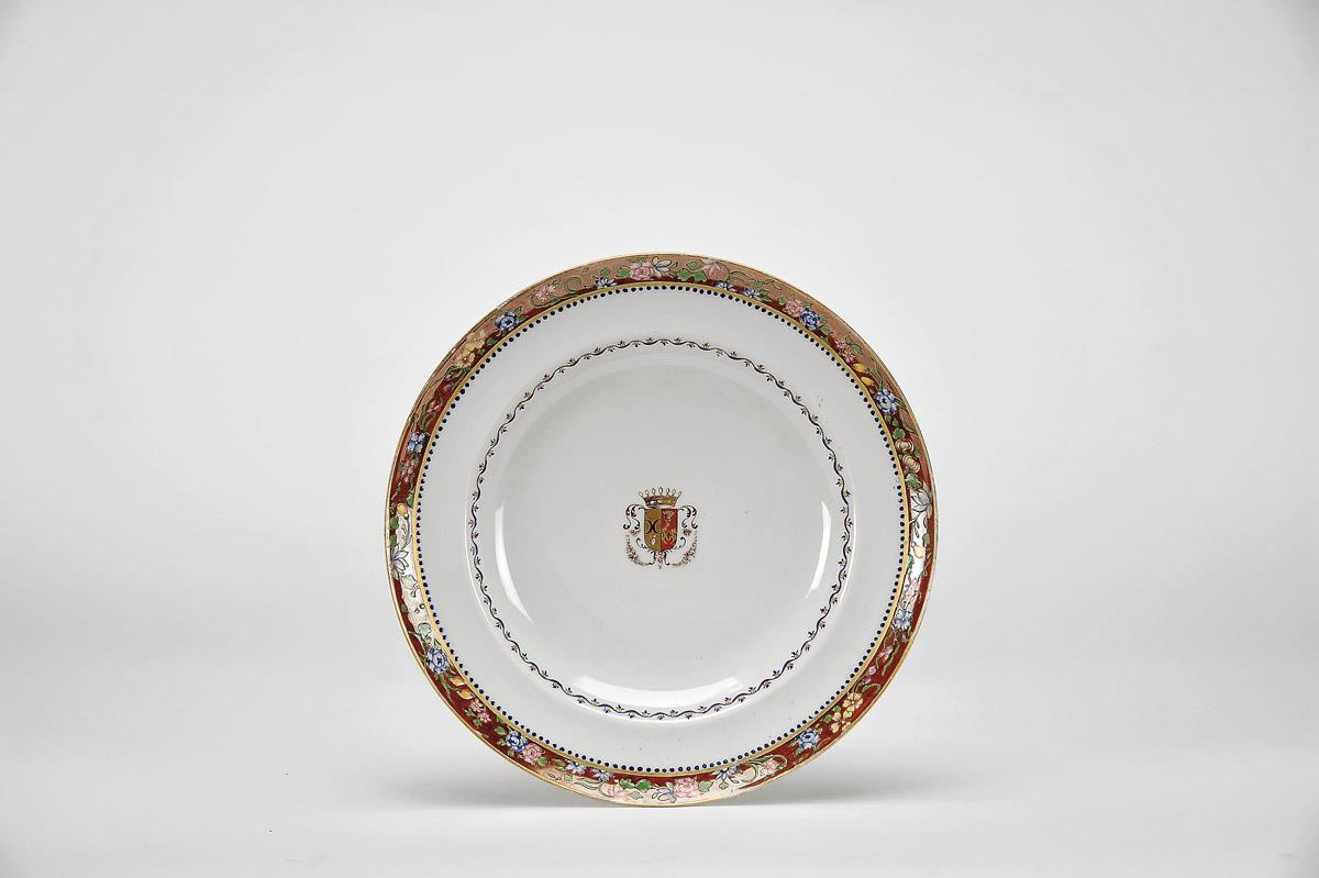 Prato de sopa porcelana chinesa de exportação decoração policromada e dourada com armas de José Maria de Almeida Beltrão de Seabra reinado Jiaqing (1796-1820) cabelos Dimensões (altura x comprimento x largura) - 25 cm Notas: vd. CASTRO, Nuno - "A Porcelana Chinesa ao Tempo do Império - Portugal / Brasil". Lisboa: ACD Editores, 2007, p. 215; e DIAS, Pedro - "Heráldica Portguesa na Porcelana da China Qing". Lisboa: Fundação Macau, 2014, pp. 308-309