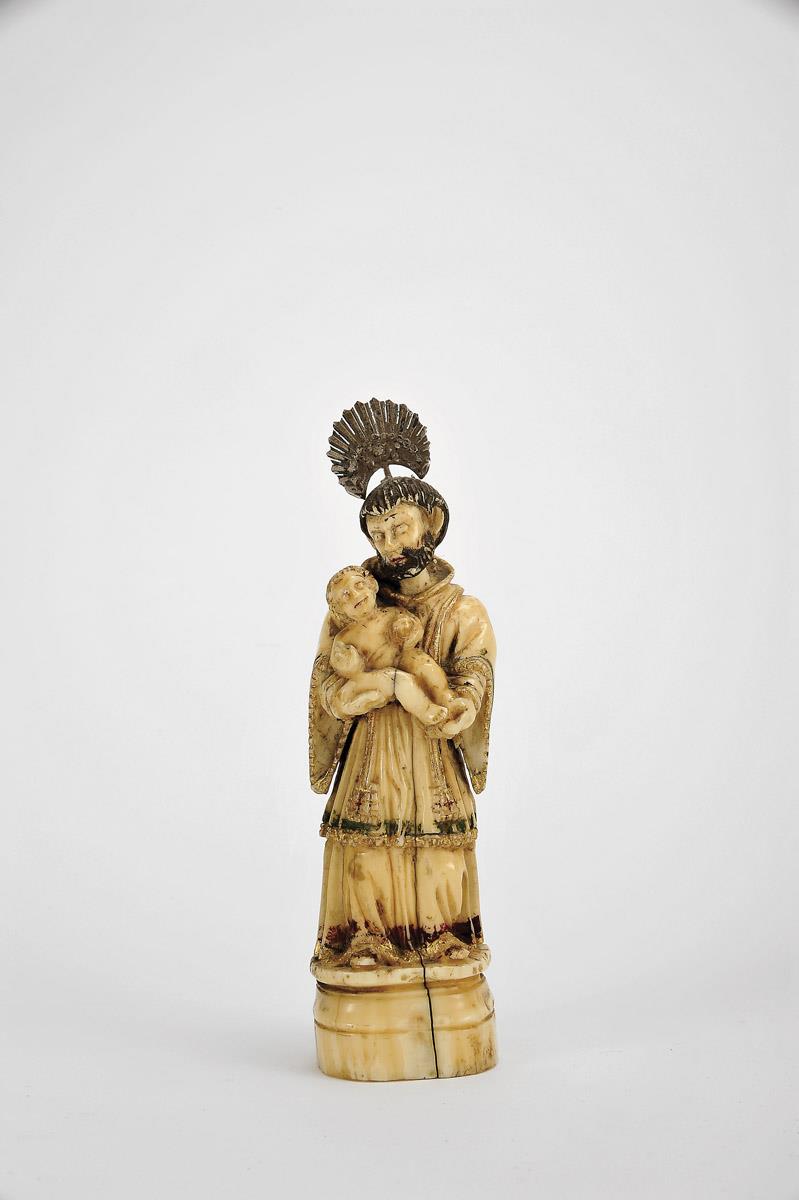 São Caetano Lusíada escultura em marfim com dourados e pintura resplendor em prata vertente indo-portuguesa séc. XVIII (2ª metade) racha na base Dimensões (altura x comprimento x largura) - 10 cm