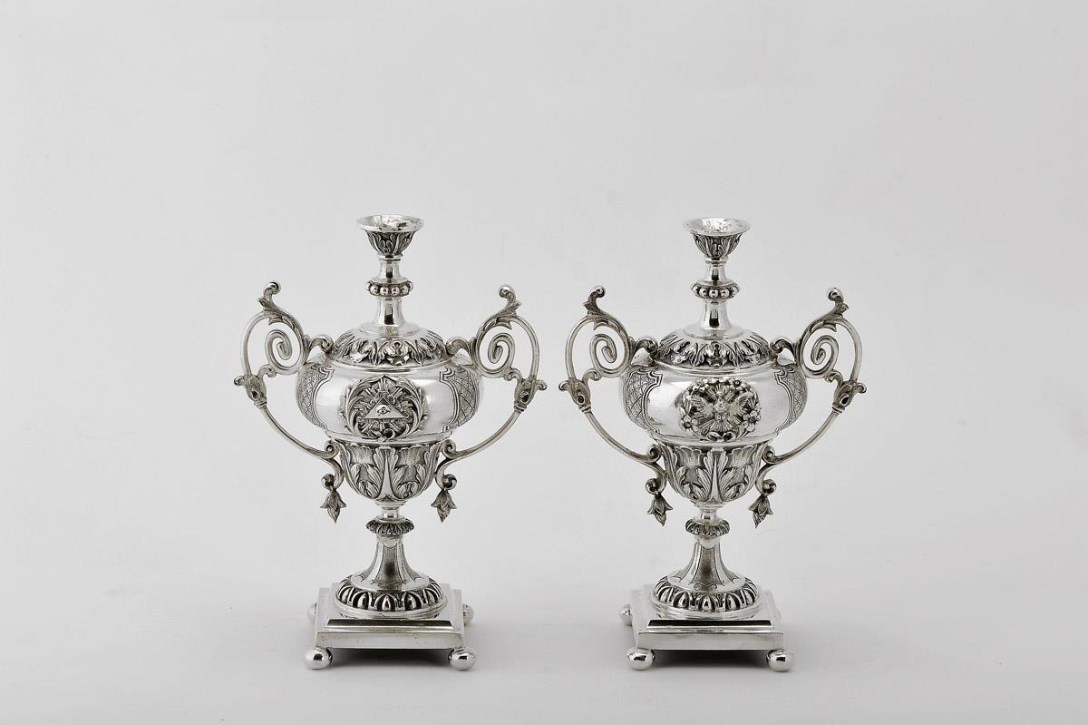 Par de ânforas (bases de palmito) prata decoração relevada "JHS" e "Espírito Santo", duplamente marcadas com marca de ourives do Porto de António Alves de Sousa (1877-1909) portuguesas Dimensões (altura x comprimento x largura) - 21 cm; Peso - 984 grs. Notas: vd. ALMEIDA, Fernando Moitinho de - "Marcas de Pratas Portuguesas e Brasileiras (Século XV a 1887)". Lisboa: IN-CM, 1995, P98; vd. VIDAL, Manuel Gonçalves; ALMEIDA, Fernando Moitinho de - "Marcas de Contrastes e Ourives Portugueses (1887 a 1993)", vol. II