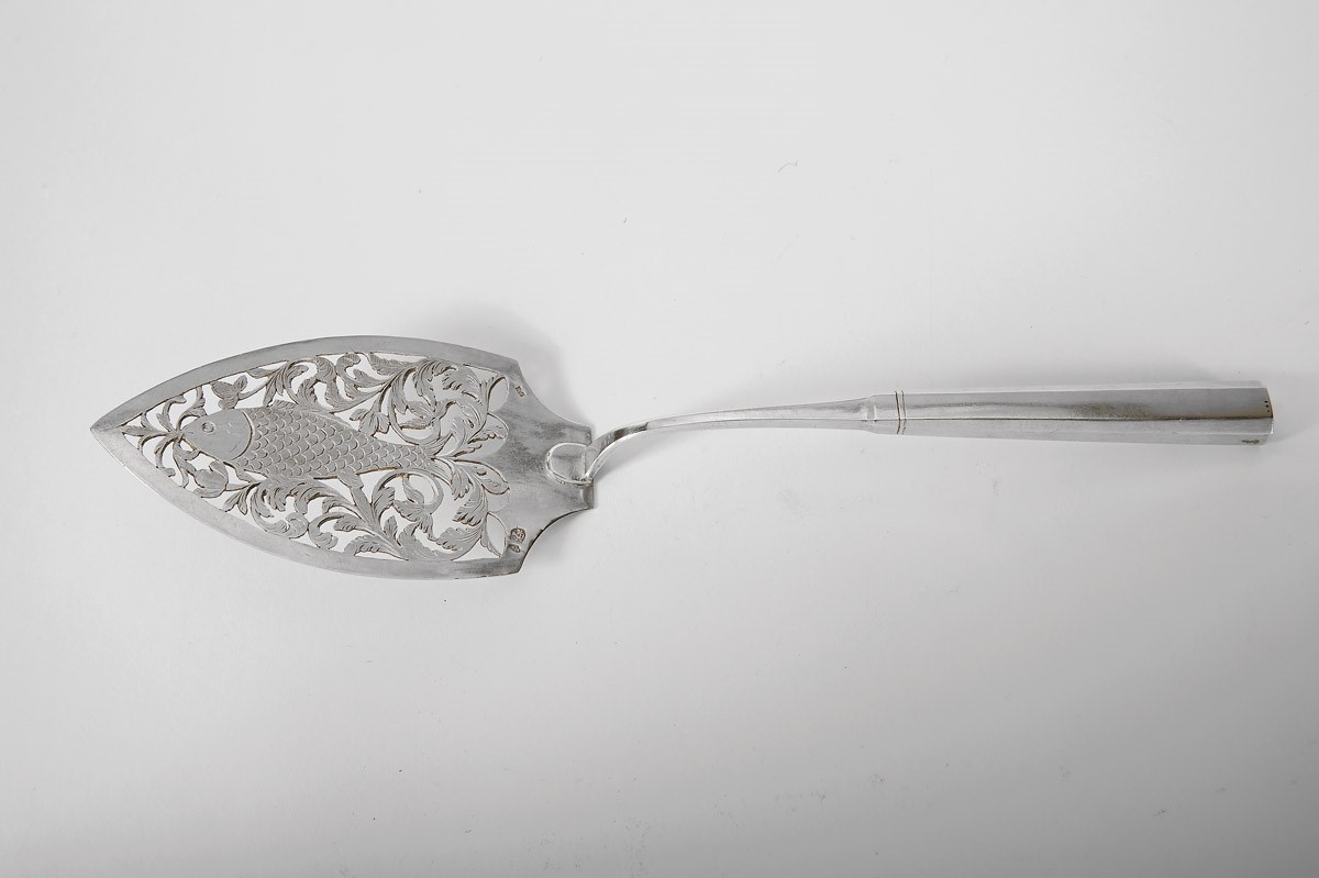 Espátula prata decoração vazada e gravada "Peixe", marca de ensaio (1810-1824), marca de ensaiador de Praga (1817), marca de ourives TA austro-húngara Dimensões (altura x comprimento x largura) - 32,5 cm; Peso - 150 grs.