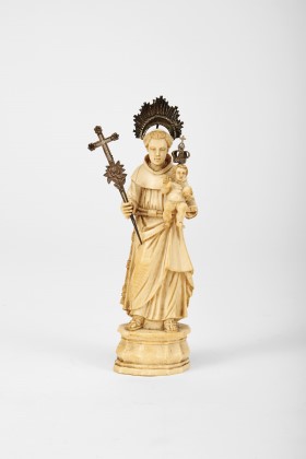 Santo António com o Menino Jesus escultura em marfim aplicações em prata vertente indo-portuguesa séc. XVIII Dimensões (altura x comprimento x largura) - 18 cm Notas: exemplar semelhante encontra-se representado em TÁVORA, Bernardo Ferrão de Tavares e - "Imaginária Luso-Oriental". Lisboa: IN-CM, 1983, p. 160, nº 211.