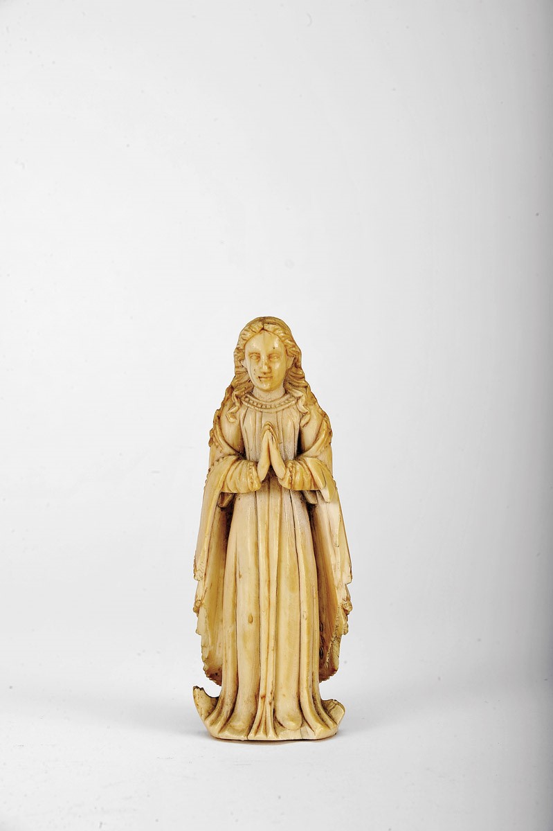 Nossa Senhora da Conceição escultura em marfim vertente indo-portuguesa séc. XVII faltas Dimensões (altura x comprimento x largura) - 12 cm Notas: exemplares semelhantes integraram a exposição "A Expansão Portuguesa e a Arte do Marfim", organizada pela Fundação Calouste Gulbenkian, Lisboa, 1991, encontrando-se representados no respectivo catálogo. Lisboa: Fundação Calouste Gulbenkian, 1991, pp. 52-55, nºs 57, 59 e 65.