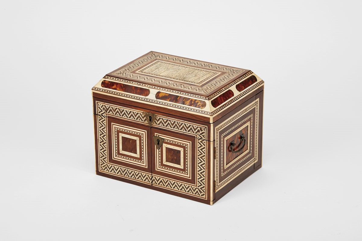 Contador de duas portas com tampa de levantar sissó revestimento com embutidos e marchetaria de marfim e marfim gravado com preenchimentos a negro, tartaruga e sissó com pinos de cobre dourado, interior com seis gavetas simulando oito com frentes revestidas a tartaruga debruada por frisos de marfim, puxadores de marfim, interior da tampa com divisórias recortadas de feição islâmica, ferragens em bronze vertente de influência Mogol séc. XVII interiores forrados posteriormente a veludo, pequenos defeitos, pequenos restauros Dimensões (altura x comprimento x largura) - 24 x 31 x 23 cm Notas: exemplares com decoração semelhante encontram-se representados em DIAS, Pedro - "Mobiliário Indo-Português". Moreira de Cónegos: Imaginalis, 2013, pp. 113 e 318, nºs 3 e 4.