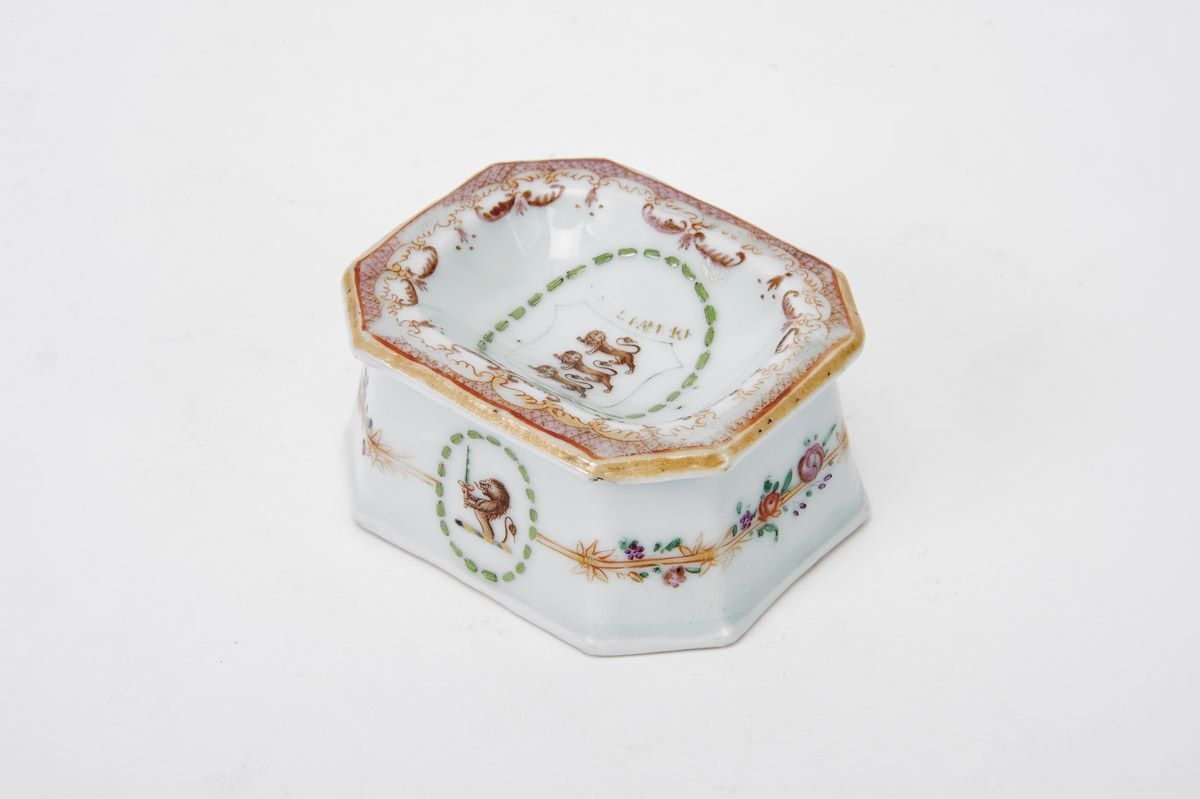 Saleiro oitavado porcelana chinesa de exportação decoração policromada e dourada com armas de família inglesa reinado Qianlong (1736-1795) pequenas esbeiçadelas, desgaste no dourado Dimensões (altura x comprimento x largura) - 4 x 8 x 7 cm