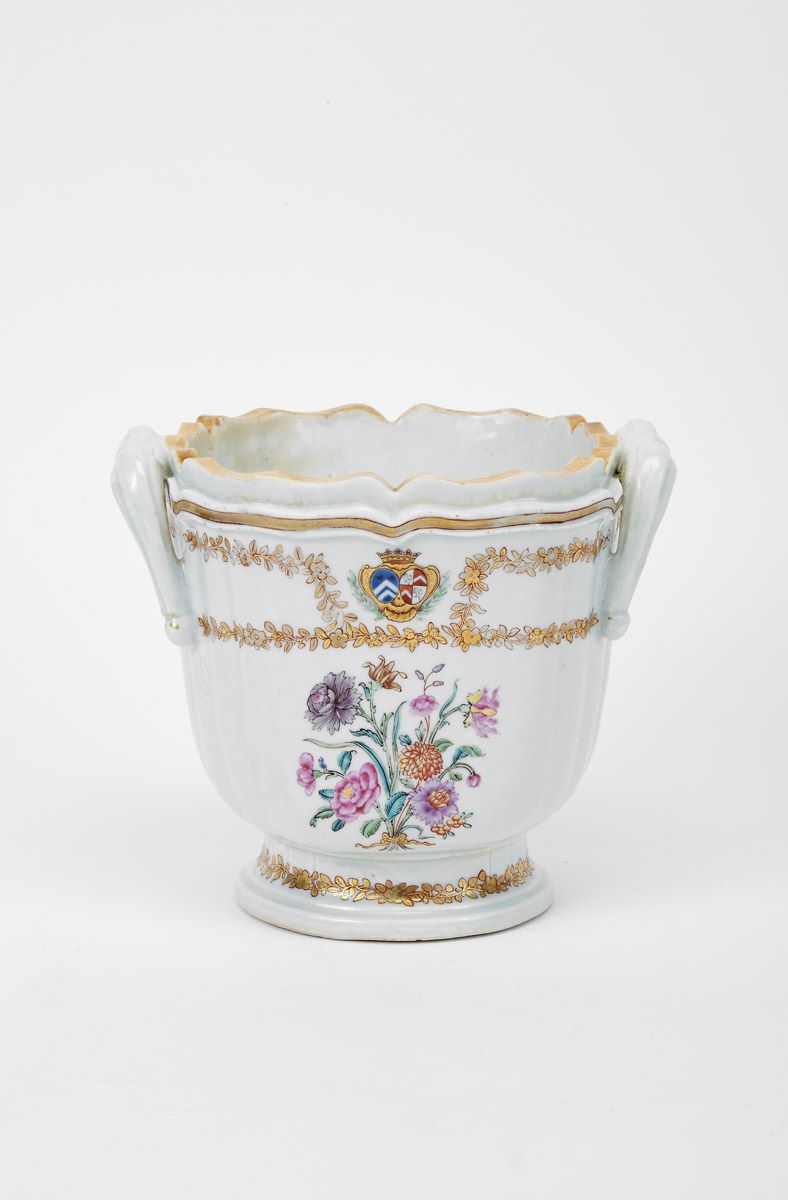 Refrescador recortado porcelana chinesa de exportação decoração policromada e dourada "Flores" e armas de Cottin de Fieulaine e de Girardot de Chancourt reinado Qianlong (1736-1795) cabelo consolidado, esbeiçadelas restauradas Dimensões (altura x comprimento x largura) - 21 x 25 x 21 cm Notas: prato do mesmo serviço encontra-se representado em LEBEL, Antoine - "Armoirie françaises et suisses sur la porcelaine de Chine au XVIII siècle". Bruxelas: Edição do Autor, 2009, p. 103.