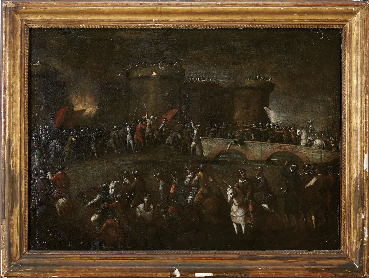 Assalto ao castelo óleo sobre tela escola francesa séc. XVII reentelado, restauros Dimensões (altura x comprimento x largura) - 75 x 102 cm