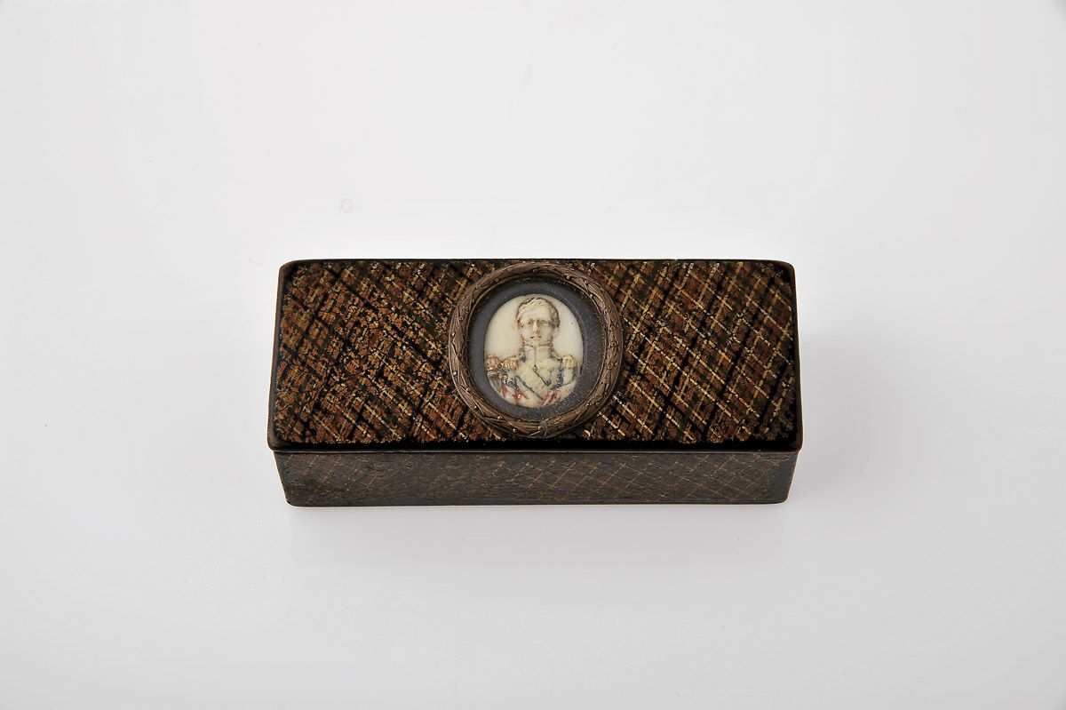 Caixa papier-maché pintado medalhão em marfim esculpido "Rei Dom Miguel I", aro em bronze portuguesa séc. XIX (1ª metade) pequenos defeitos, desgaste na pintura Dimensões (altura x comprimento x largura) - 3 x 10 x 4 cm