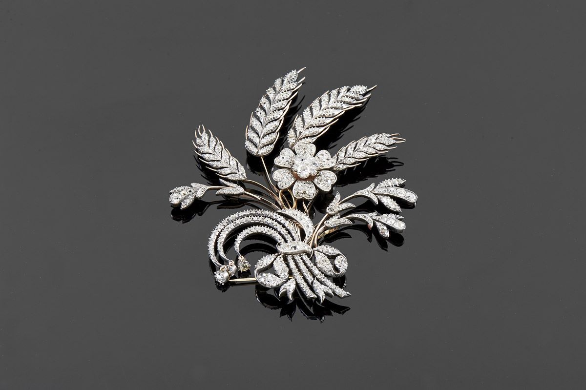 Alfinete "Espigas" ouro e prata cravejado com cerca de 491 brilhantes de talhe antigo com o peso aproximado de 24 ct. Português pequenos restauros estojo original, marca da Contrastaria de Lisboa IN-CM Dimensões (altura x comprimento x largura) - 10,5 cm; Peso - 54,5 grs. g. Notas: acompanhado pelos Relatórios de Ensaio 273/2015/LAL e 274/2015/LAL realizados pelo Laboratório de Análises da Contrastaria de Lisboa - Imprensa Nacional -Casa da Moeda - por Espetrometria de Fluorescência de Raios-X Dispersiva de Energias (EFRXDE) - os quais são de 414 milésimos (ouro) e de 970 milésimos (prata).