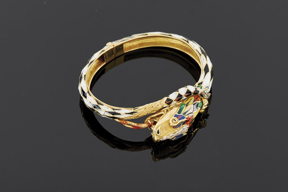 Pulseira rígida "Cobra" ouro decorada com esmaltes policromados, cravejada com 7 diamantes em talhe de brilhante com o peso aproximado de 0,10 ct. portuguesa pequenas faltas e defeitos nos esmaltes contraste do Porto (1938-1984), marca de ourives Rosas de Portugal (1947) Notas: vd. VIDAL, Manuel Gonçalves; ALMEIDA, Fernando Moitinho de - "Marcas de Contrastes e Ourives Portugueses (1887 a 1993)", vol. II. Lisboa: IN-CM, nº 110 e 2999.
