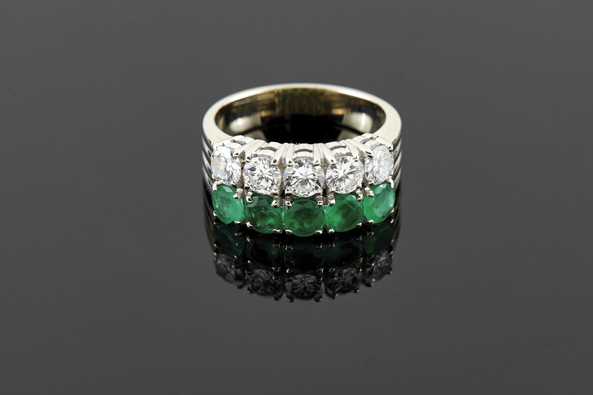Anel ouro cravejado com 5 esmeraldas com o peso aproximado de 0,70 ct. de e 5 diamantes em talhe de brilhante com o peso aproximado de 1,10 ct. português contraste do Porto (1938-1984), marca de ourives ilegível Dimensões (altura x comprimento x largura) - 12 (16,5 mm) cm; Peso - 8,4 g. Notas: vd. VIDAL, Manuel Gonçalves; ALMEIDA, Fernando Moitinho de - "Marcas de Contrastes e Ourives Portugueses (1887 a 1993)", vol. II. Lisboa: IN-CM, nº 17 e 33.