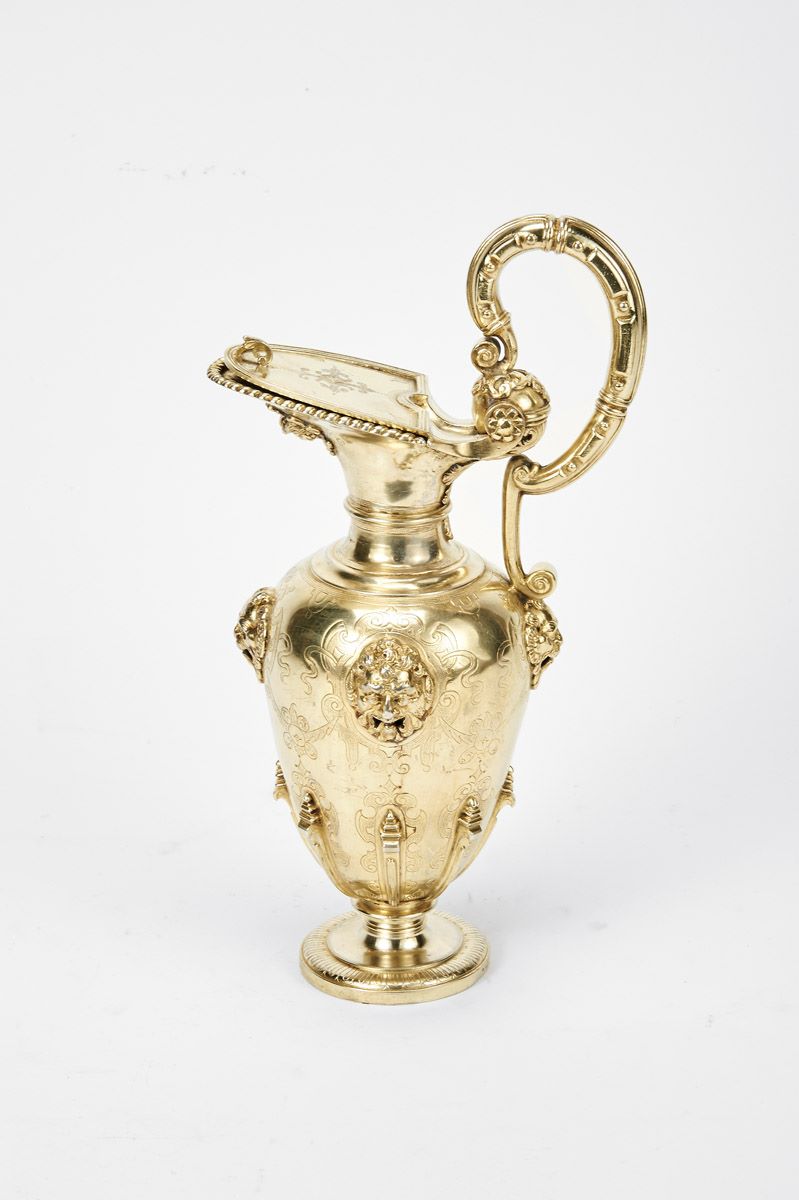 Jarro com tampa ao gosto renascentista prata dourada decoração relevada e gravada "Mascarões, «contrafortes» e cartelas" espanhol séc. XVI/XVII restauros marcado com marca de ourives de Braga HA, remarcado com "Cabeça de Velho" Dimensões (altura x comprimento x largura) - 33,5 cm; Peso - 1727 g. Notas: vd. ALMEIDA, Fernando Moitinho de - "Marcas de Pratas Portuguesas e Brasileiras (Século XV a 1887)", IN-CM, 1995, B36; FERNANDEZ, A; MUNOA, Rafael; RABASCO, Jorge. - “Enciclopedia de la Plata española y Virreinal americana”. Edición de los autores: Asociación Española de Joyeros, Plateros y Relojeros: Federación Española de Anticuarios y Almonedistas, Madrid, 1984, 1992, p. 477; MARTÍN, Cristina Esteras – “La Platería de la Colección Varez Fisa - Obras escogidas Ss XV-XVIII”. Madrid, TF Editores, 2000, pp. 101 a 104, nº 37.