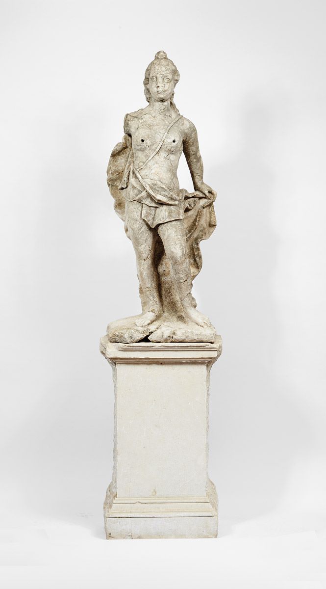 "Diana - Deusa da Caça" - fonte de centro de lago escultura em mármore saídas de água pelos peitos e nas costas pela boca de um faisão, base adaptada em mármore portuguesa séc. XVII/XVIII pé partido, falta de um braço, desgaste, faltas e defeitos Dimensões (altura x comprimento x largura) - 208 (total) cm