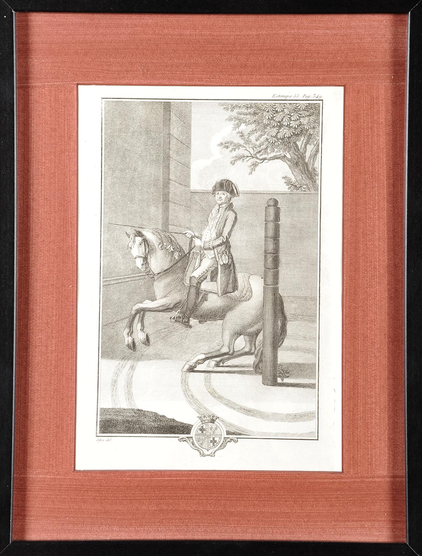 "Arte equestre - Marquês de Marialva" gravura a talhe-doce da obra de Manuel de Andrade "Luz da Liberal e Nobre Arte da Cavalaria" (Lisboa, 1790) original de Joaquim Carneiro da Silva subscrição Silva delin. Dimensões (altura x comprimento x largura) - 28,5 x 20 cm