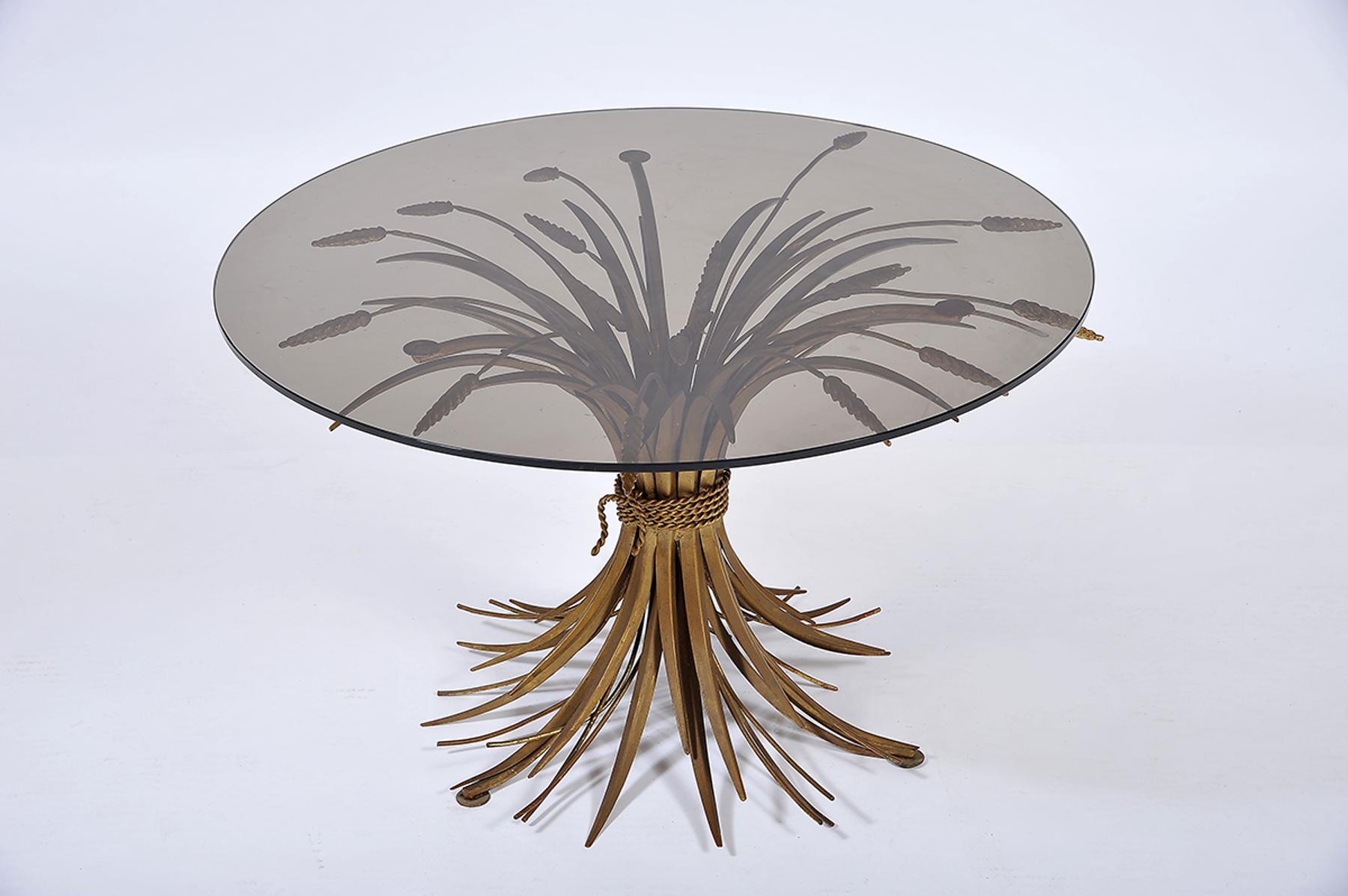 Mesa de apoio "Modelo Bagués" folha de metal pintado e dourado "Espigas" tampo de vidro fumado Europeia séc. XX sinais de uso, pequenos defeitos Dimensões (altura x comprimento x largura) - 45 cm